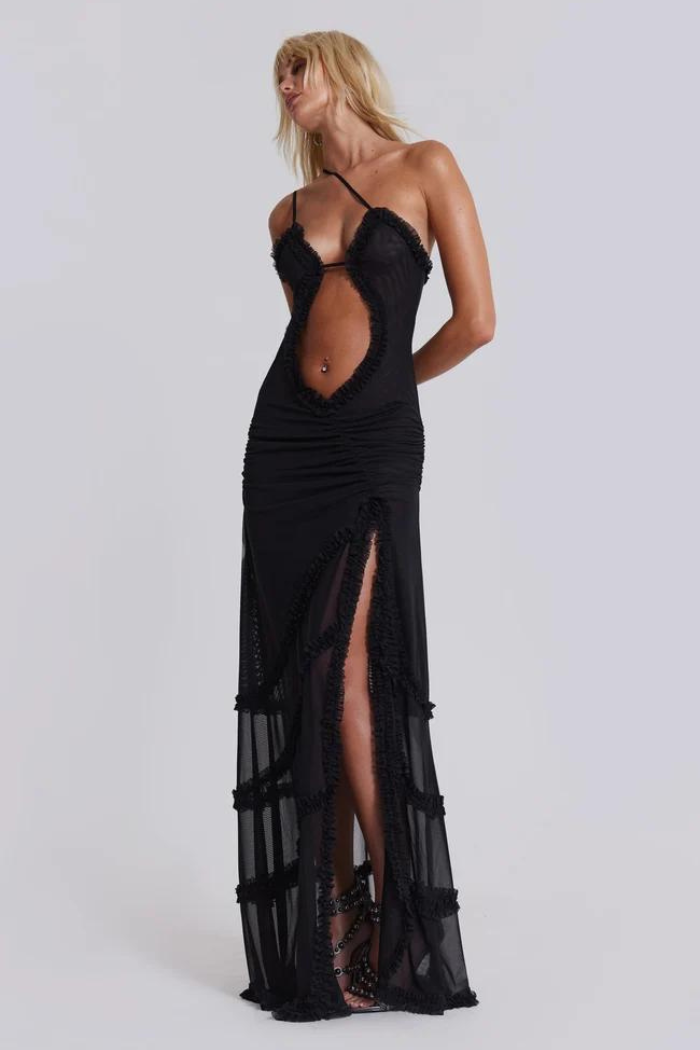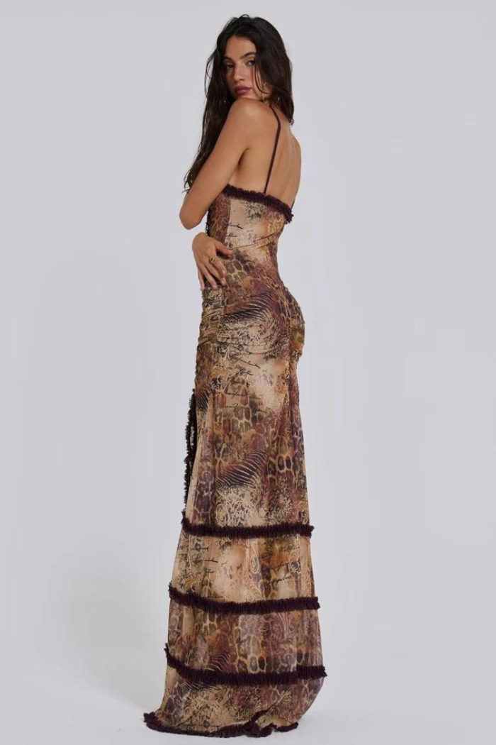 - Highlight the stunning sunrose color of the Fatale Maxi Dress as a key feature.