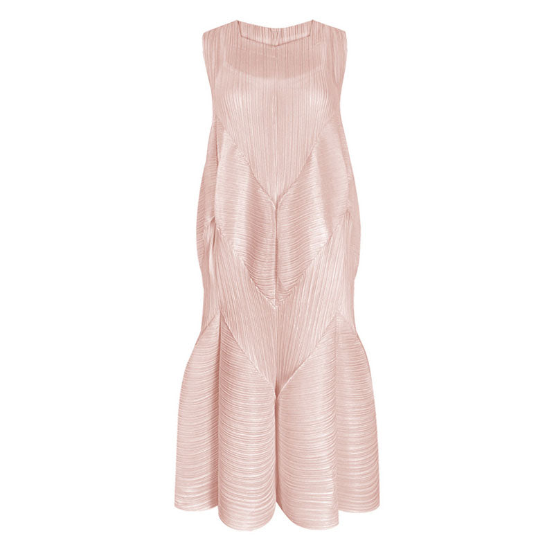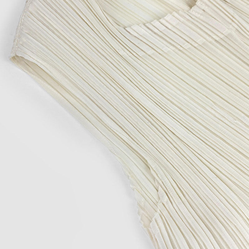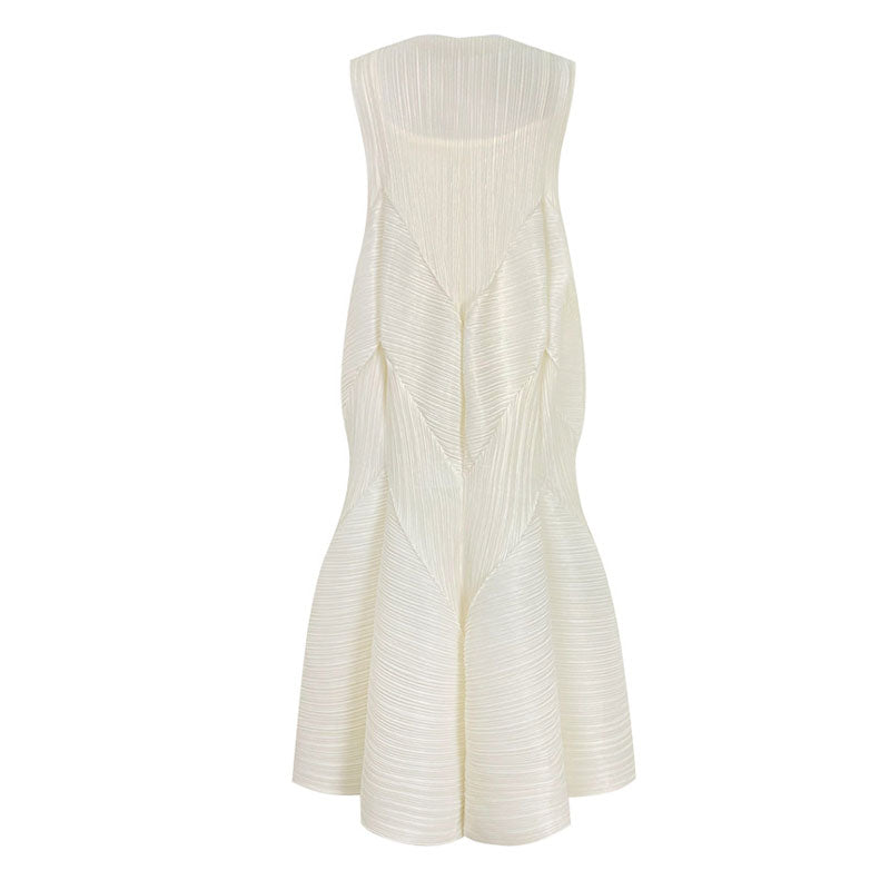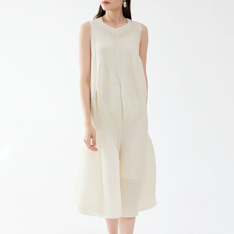 With attention to detail at every turn. this refined tank midi dress embodies a subtle sense of luxury throughout. It is meticulously designed. exuding a charming and casual vibe. The simple sweetheart neckline. sleeveless silhouette. and unrestricted form allow for effortless movement. The interplay of pleats. both dense and sparse. creates a harmonious balance of movement and stillness. achieving a perfect fusion of artistry and functionality. Crafted from semi-sheer textured fold fabric. this designer sleeveless midi dress is accompanied by a slip lining. providing a delicate combination of style and comfort. Even the most poised and professional woman will emanate a softened allure when adorned in these pleats.Â