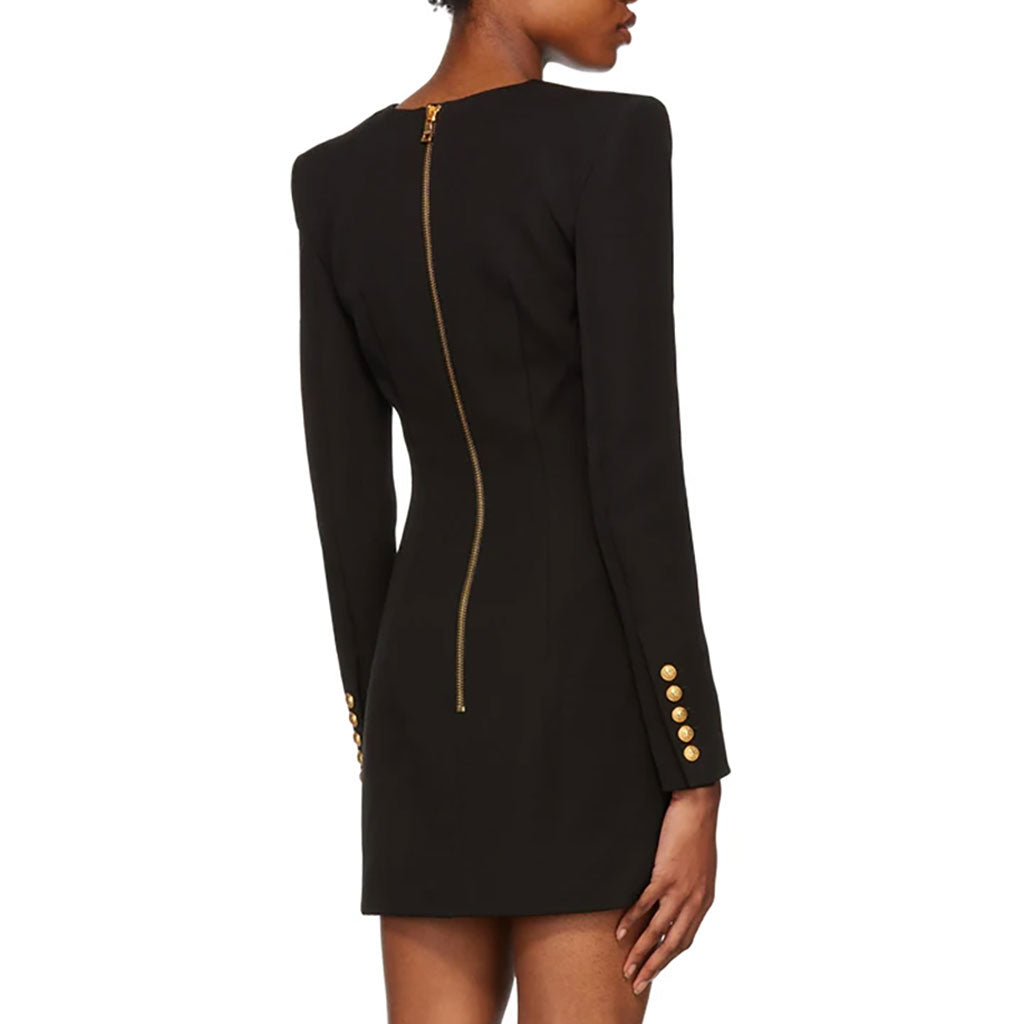 We never knew how much we needed a tailored blazer until now. Our designer blazer unquestionably looks luxurious and will elevate even the simplest jeans outfits. The polished longline blazer is styled with an asymmetric single breasted silhouette with darted waist for a sophisticated. tailored look. The slim fit features long sleeves. shoulder pads and a non-collar V-neckline and is decorated with embossed gold-tone buttons on the cuffs. It has an exposed metal zip fastening to the back for easy on and off. Show off your leg by pairing this blazer with the matching shorts or skirts as this enticing piece is assured to add inexplicable elegance to your ensemble. By the way. we love the ideal of scrunching up sleeves.