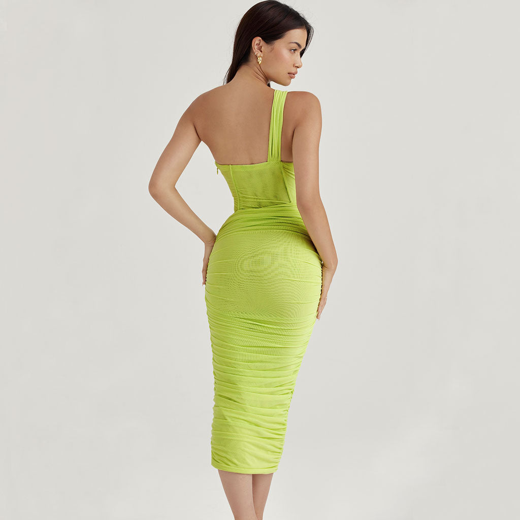 Asymmetric One Shoulder Cutout Ruched Corset Mesh Midi Dress - Lime