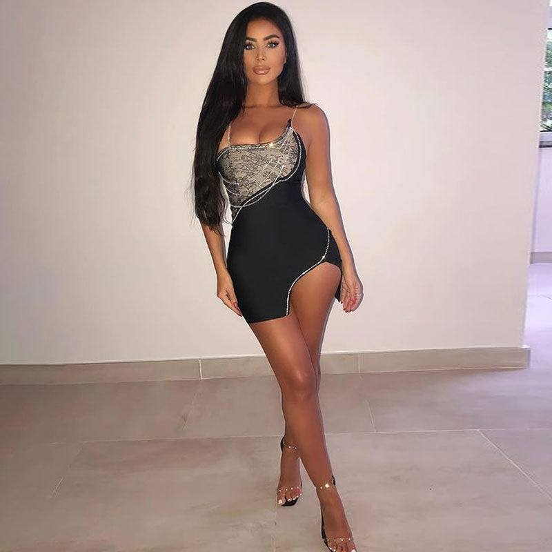 The bandage mini dress brings a sophisticated edge to party wear. Embellished with tiers of crystal chains trimmed along the bodice. this black mini dress provides a luxurious and glamorous look with a hint of daring. showcasing a unique asymmetric neck. camisole straps and a sexy thigh split. The lace spliced design adds a sense of feminine sexuality that party needs. Slip into the Luxe's designer mini dress for an effortlessly chic and flattering outfit.