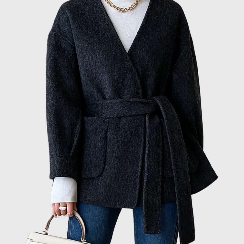 This Belted Cardigan with Pockets offers an elegant look with its V neckline. long sleeves. and self-tie belt. It features dropped shoulders. textured fabric. and side pockets. making it a modern and stylish choice for any wardrobe.
