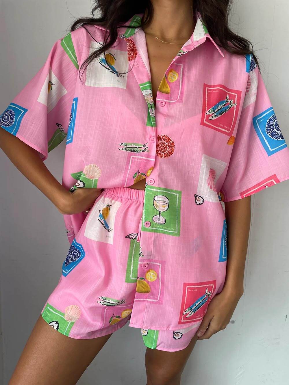 Casual Printed Shirt Lace-Up Elastic Shorts Set