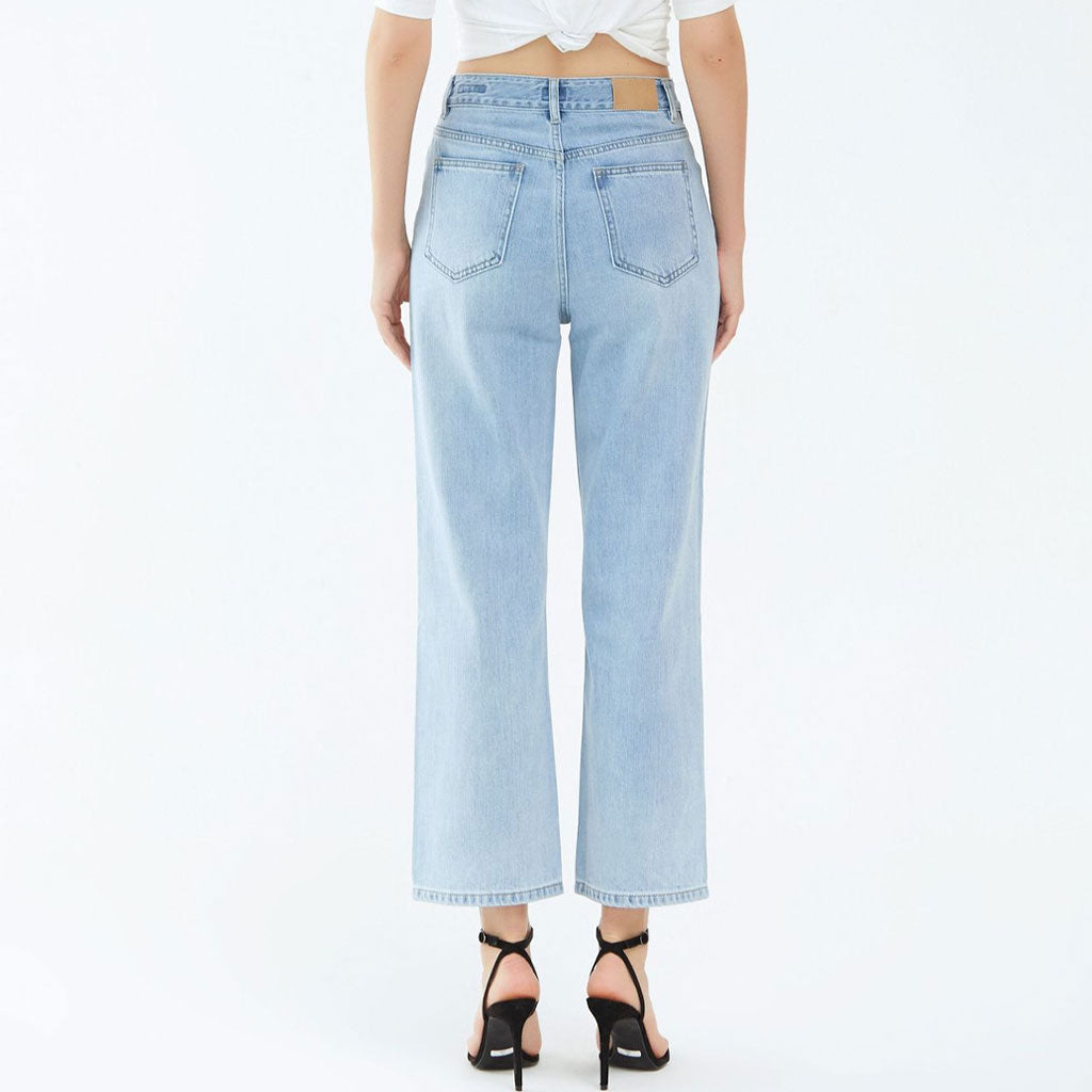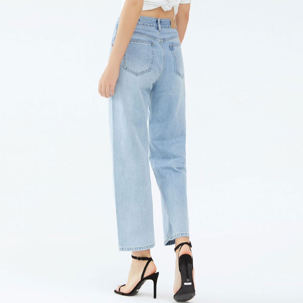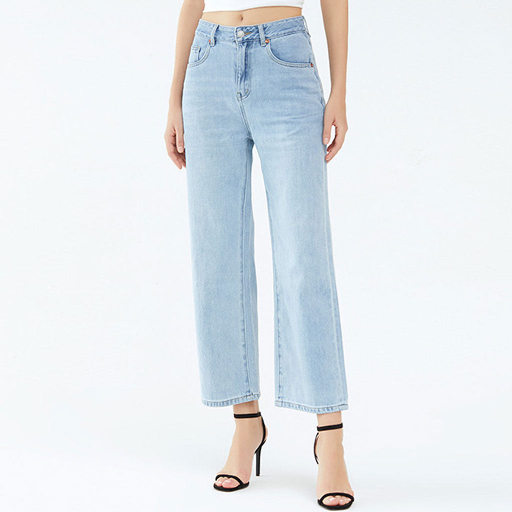 Refresh your bottoms rotation with these mid rise jeans. They feature a loose fit through the hips and thighs before settling into a wide leg silhouette and finish to the ankle-length hem. They're easy to wear light blue wash in super soft blended cotton which make them a perfect staple for summer vibes. They're also adorned with fading and whiskering which give off a timeless "worn in" style. With pockets. belt loops. a classic button closure and zip fly. they're easy to style and extremely versatile as dress it up with a cropped halter top and stilettos for a date look or down with sneakers and a graphic tee for your daily wear.