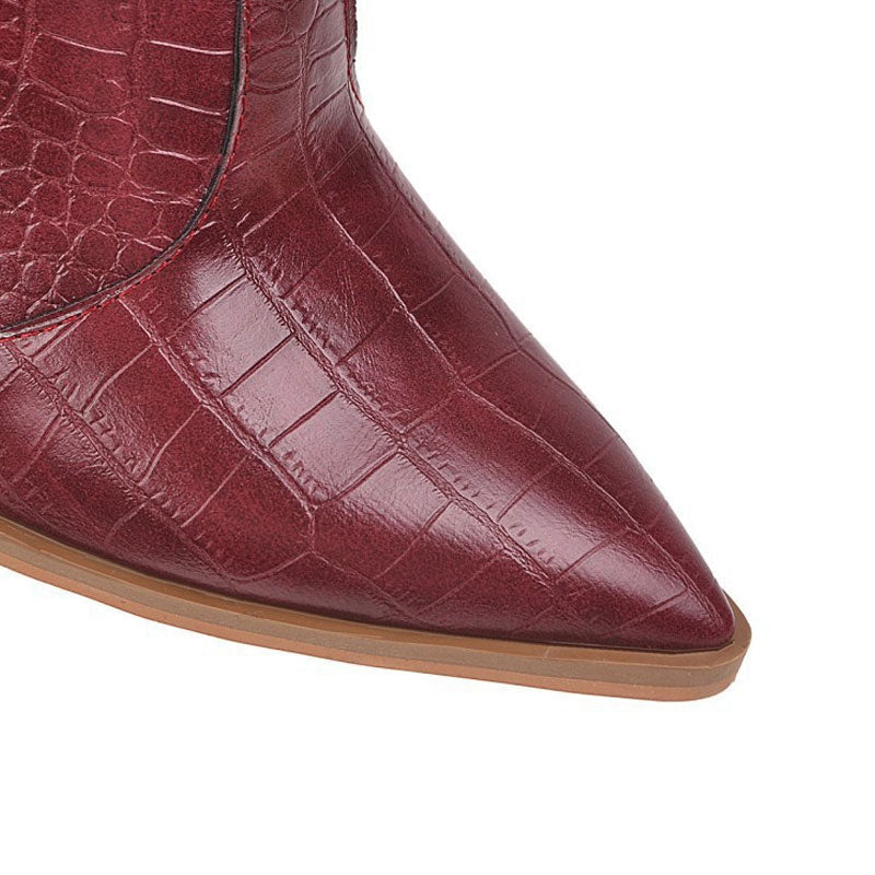 Classy Croc Effect Geometric Heel Mid Calf Western Boots - Burgundy