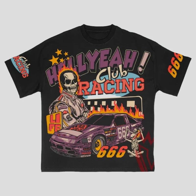 The Oversized Club Racing 666 Skull T-Shirt is a high street fashion piece perfect for juniors who love edgy style. This Club Racing tee is designed for all seasons. featuring a short clothing length and a striking tie-dye decoration. Made from 100% cotton. the non-stretch knitted fabric ensures comfort and durability. The regular sleeve style with five-point middle sleeves and O-neck collar adds to its casual appeal. The oversize pattern with skulls and printing and letters detail captures the essence of youth trend fashion. Ideal for youth aged 18-25. this Club Racing T-shirt is a standout choice for summer 2024.