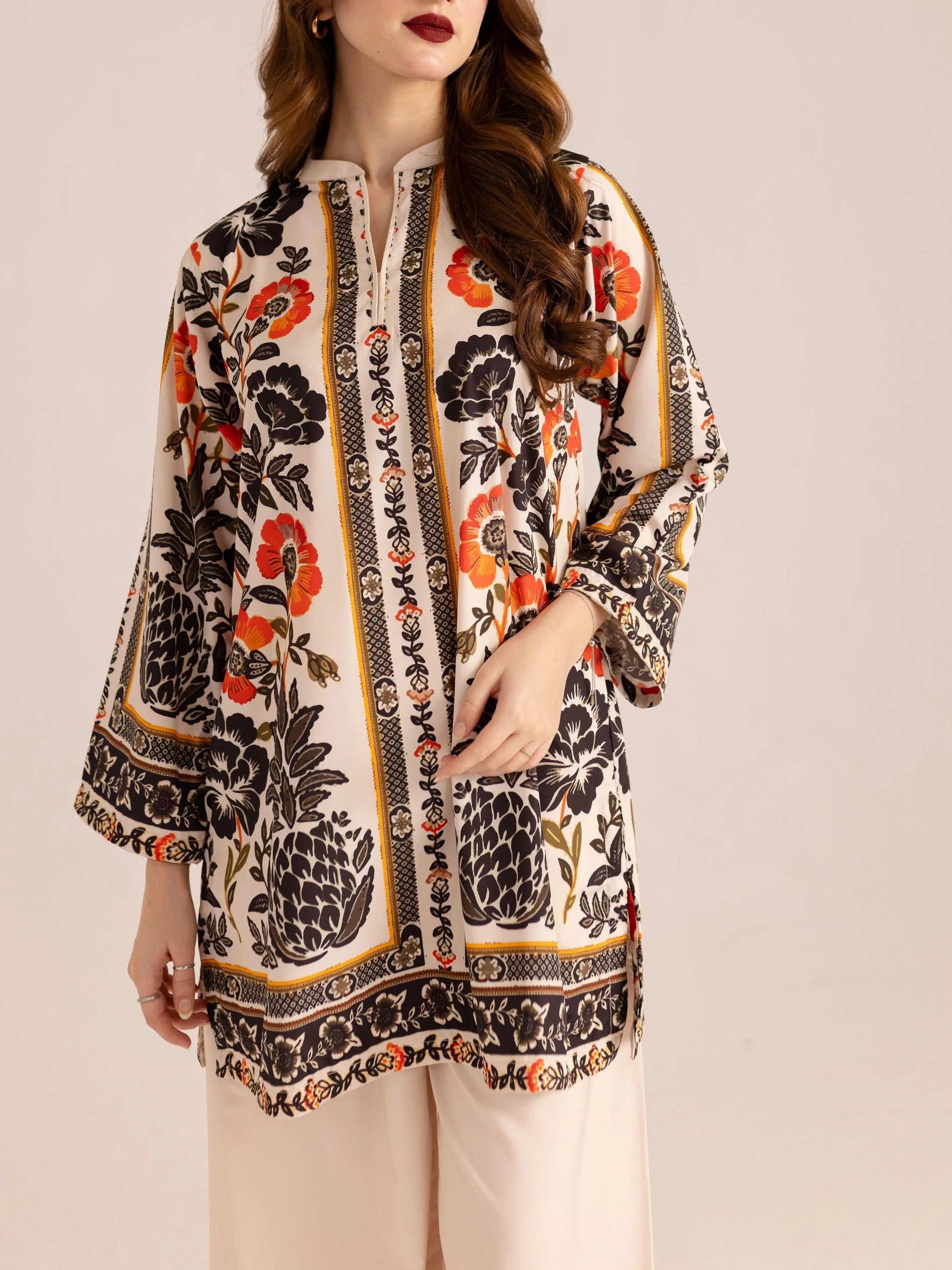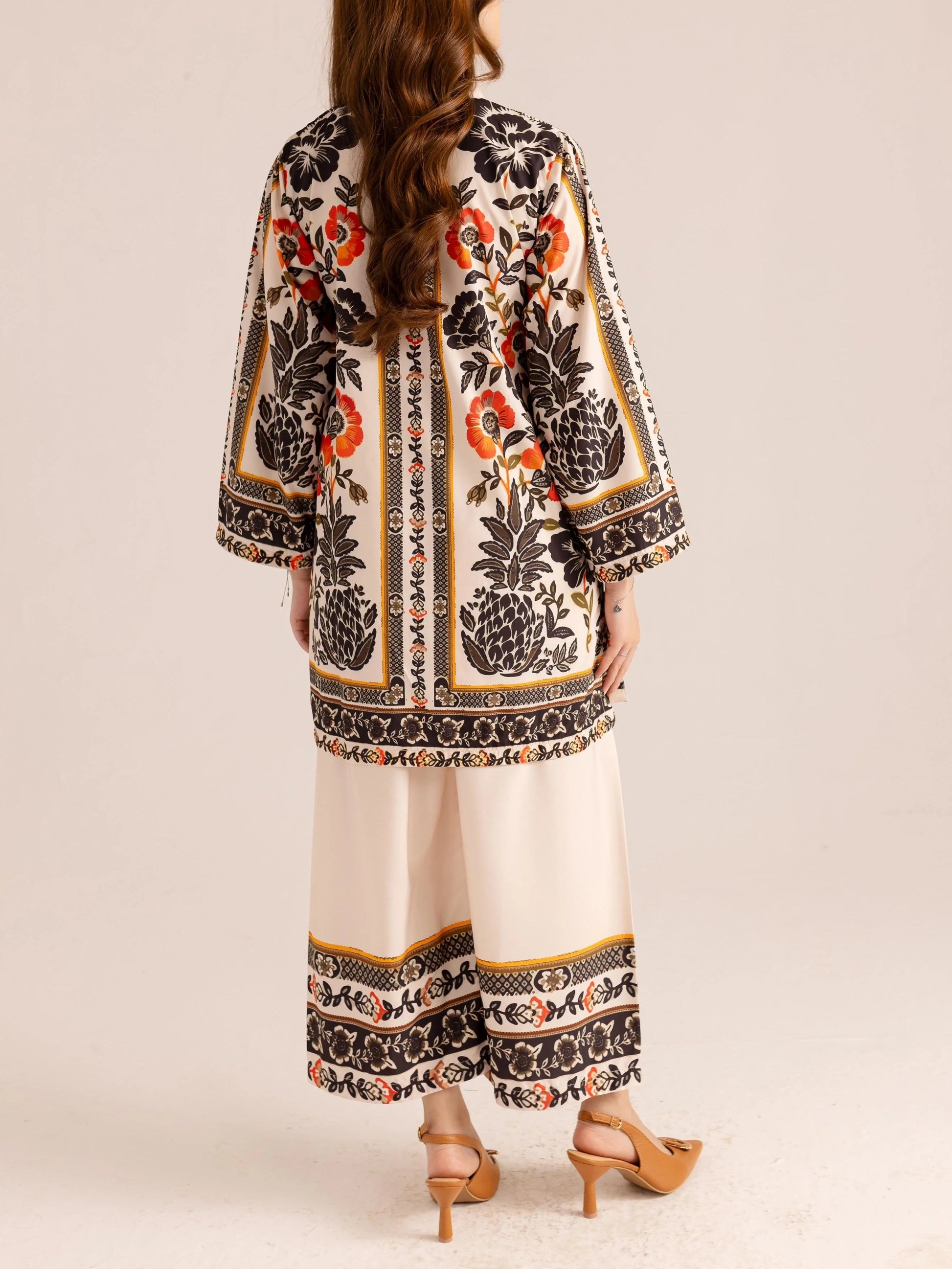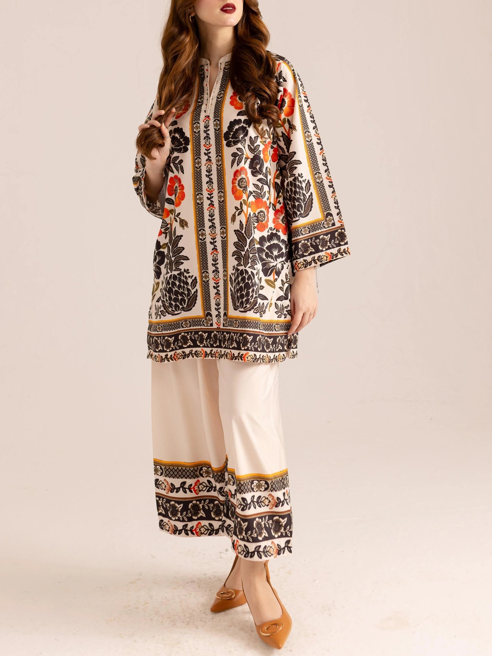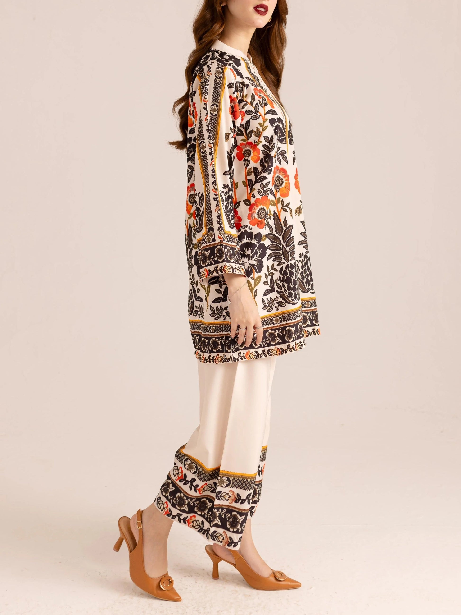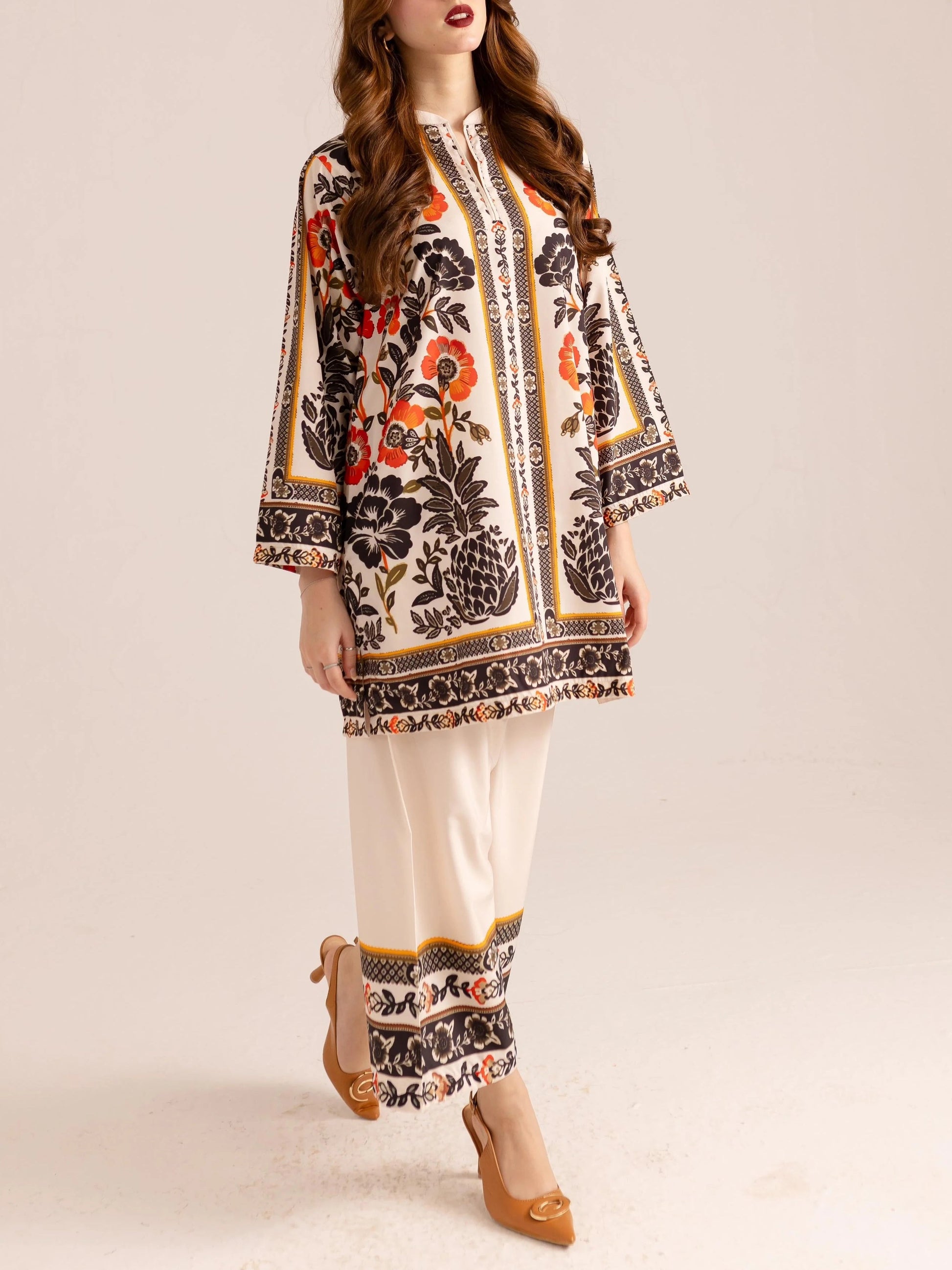 This co-ord set blends vintage charm and modern style. The top. in soft cream. showcases bold floral prints in black and orange. plus intricate border details. Paired with matching - trimmed wide - leg pants. it offers a relaxed yet refined silhouette. Crafted from smooth fabric. it ensures comfort. Ideal for adding an elegant. cultural - infused touch to your wardrobe. suitable for both casual meet - ups and special occasions.