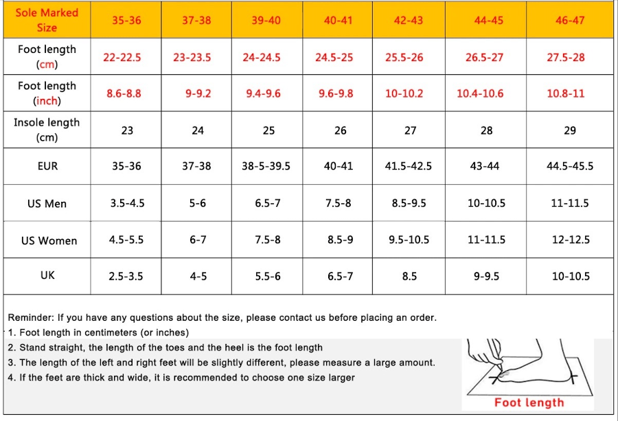 2. Select the size based on the measured length. Note: Our shoes may have international sizing.