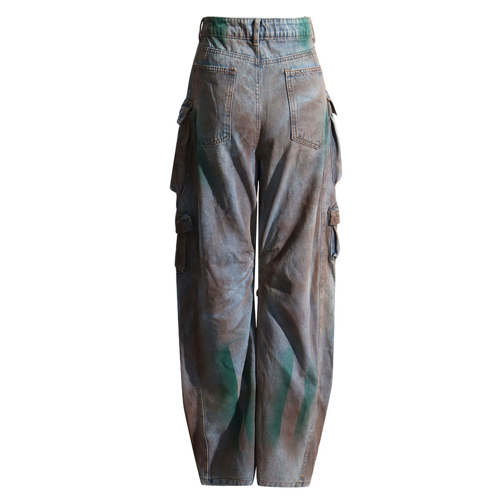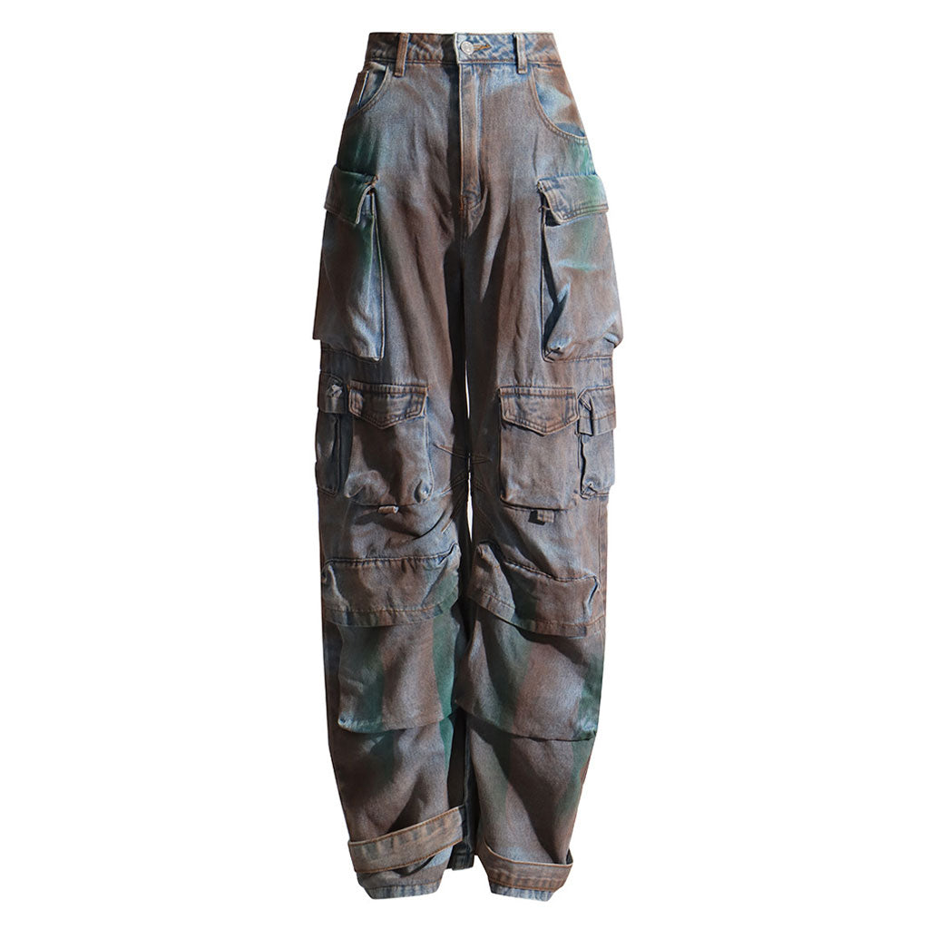 Feast your eyes on these oversized denim cargo pants in camouflage - perfect for that playful street-style vibe! These pants boast curved legs that stack the length and offer a multitude of pockets. including classic five pockets and cargo ones. They're all about that swag factor! Secured with a zipper fly and a button. these horseshoe denim pants feature a high waistband and wide openings. completed with extra strap accents for an added touch of flair. Don't miss out on this camo beauty!
