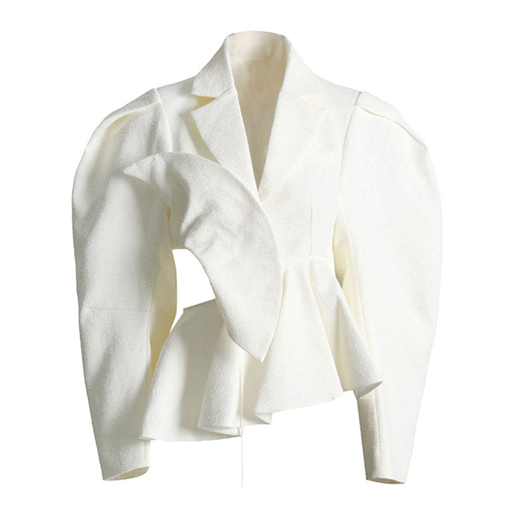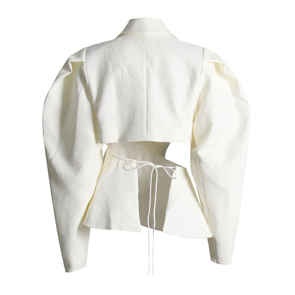 Unleash your fashion-forward flair with our exquisite jacket. The carefully placed cutout side and asymmetrical peplum design offer a unique and stylish touch. while the back tie at the waist creates a flattering and feminine silhouette. Whether dressing up for a formal event or elevating your everyday look. this jacket is the perfect choice. With its versatile design and impeccable attention to detail. this designer jacket boasts a deconstructed silhouette and statement puffy long sleeves that exude confidence and class. Whatever your style. this jacket is sure to become a cherished staple in your fashion arsenal.
