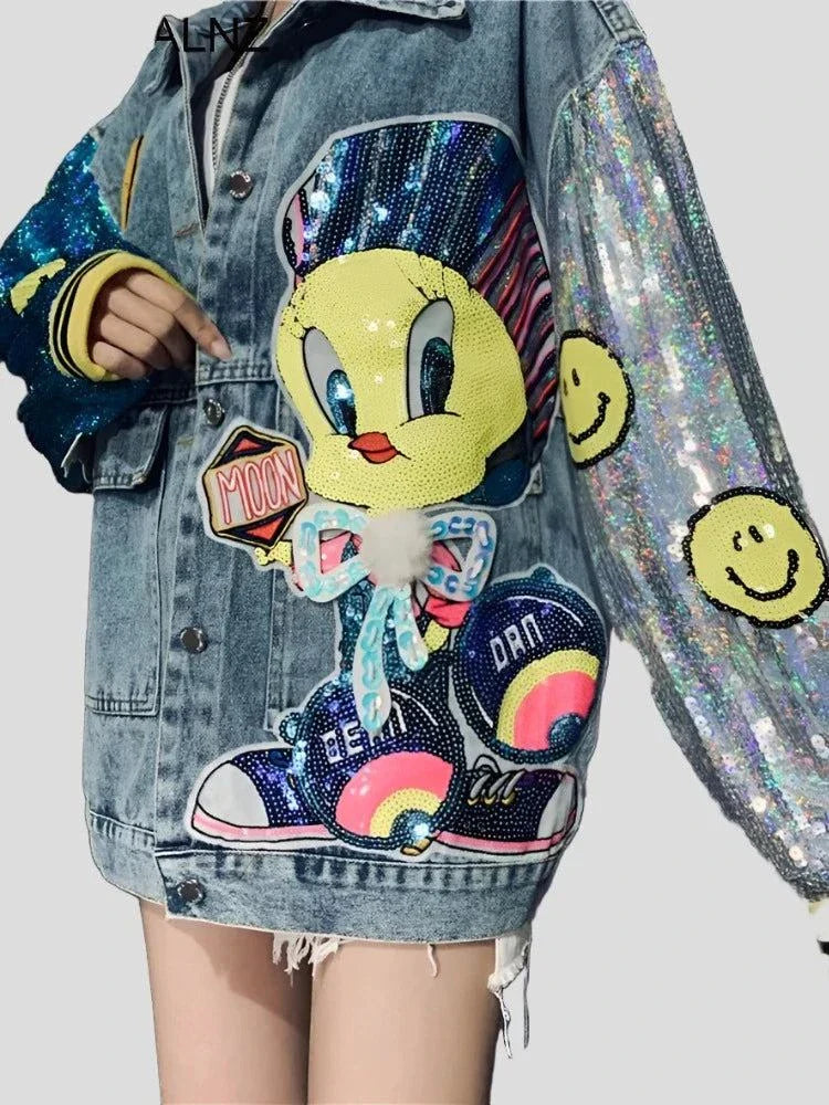 This vintage-inspired women's denim jacket features playful cartoon sequin accents. adding a touch of fun and whimsy to your outfit. Made from durable denim. it provides both style and durability for daily wear. Elevate your wardrobe with this unique and charming addition.