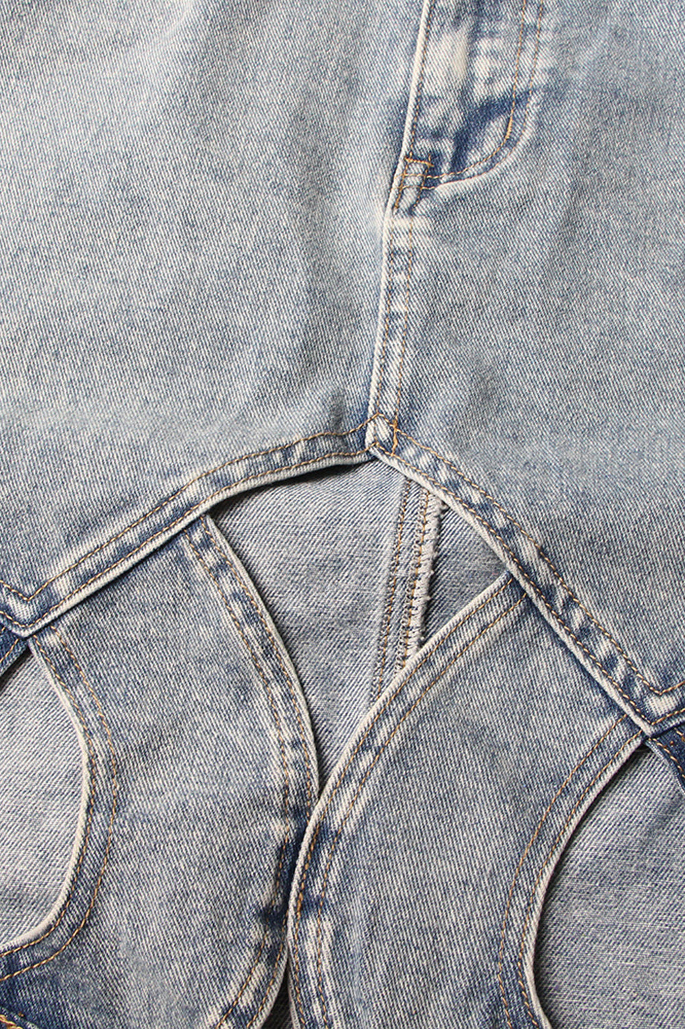 This knee-length skirt is crafted from light blue denim. adorned with darker blue denim patches. shaped like circles. that are arranged in a diagonal pattern. adding an element of visual interest to the piece. The skirt features a waistband with belt loops and a button closure. ensuring a secure and comfortable fit.