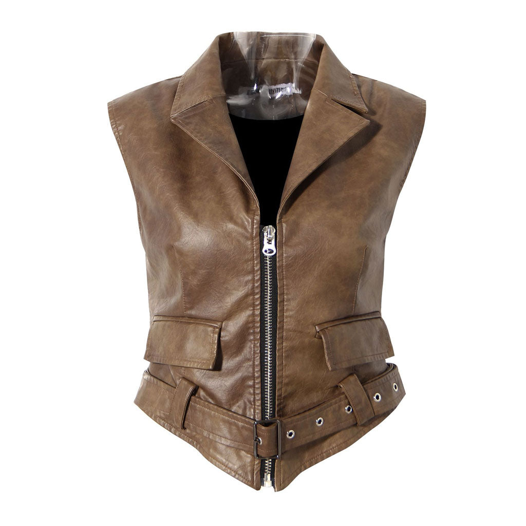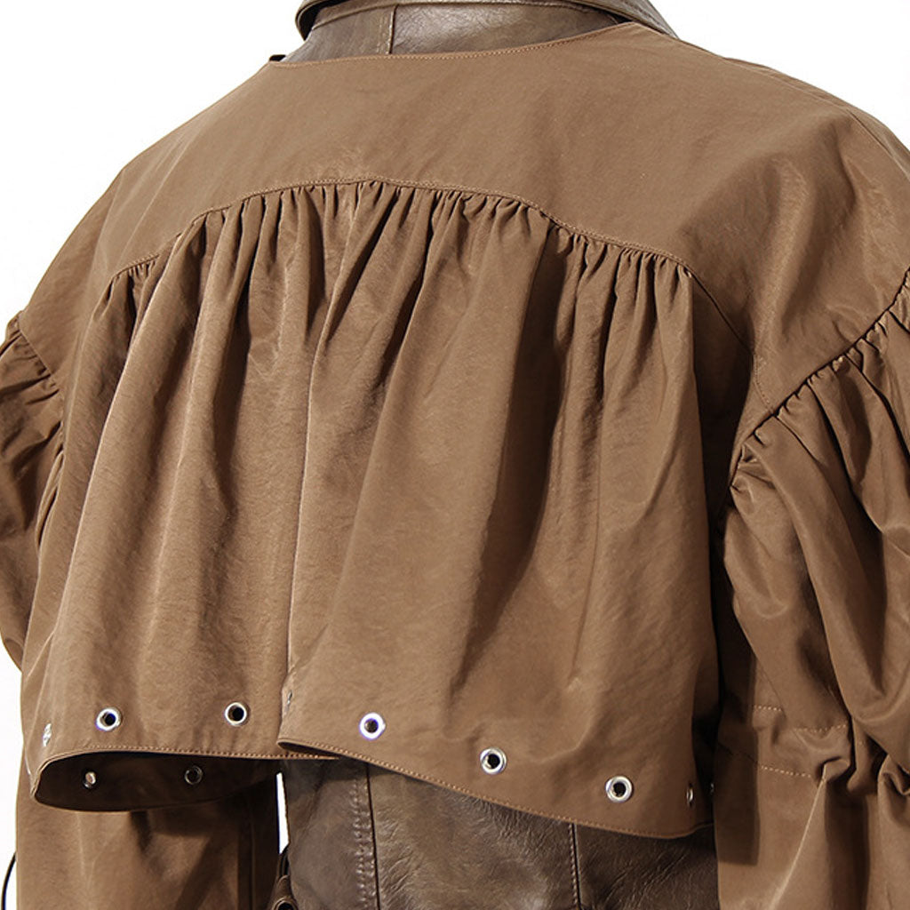 Time to update a cool girl's wardrobe with this chic attire. Bound to be your new go-to outerwear that's in equal parts sweet and edgy. the brown number features a detachable puff-sleeve cape that can be worn as a faux-leather vest with the cape off. or a jacket for the spring going-out. It's cut in a tailored-fit with darted seams and the V-shaped crop silhouette cooperates with the tonal belt that gives an endless cool spirit to the look. It zips up with a metal fastening to the front. and has functional flap pockets for a modern chic style. To make a black-and-pink outfit by pairing it with fitted pants and equestrian style boots. that's sure to create a buzz.