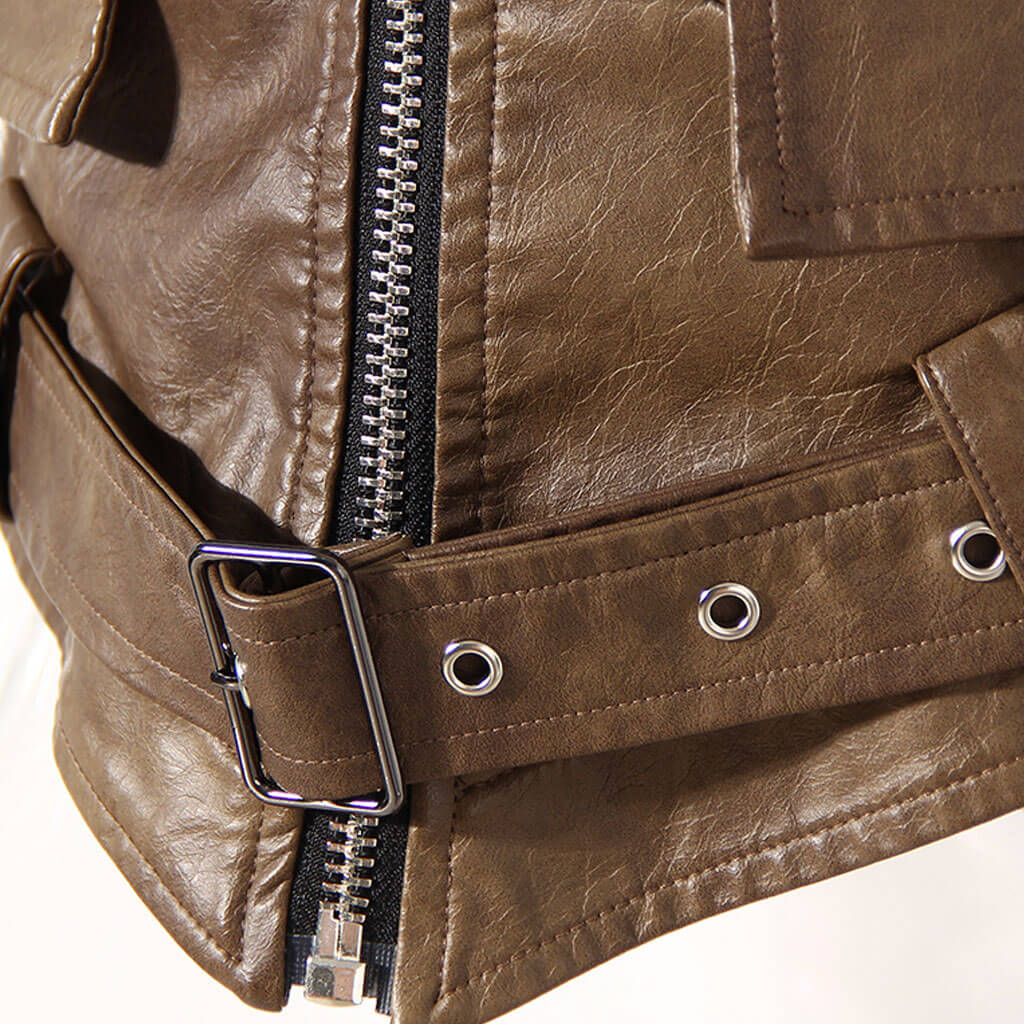 Detachable Puff Sleeve Folded Collar Belted Vegan Leather Cropped Jacket