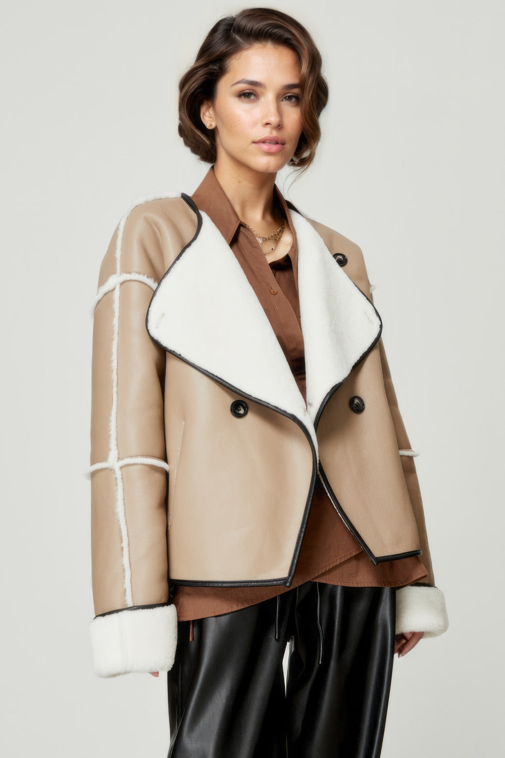 A must-have for cold weather. this double-breasted faux shearling jacket will keep you warm and comfortable in style. The regular fit silhouette and dropped shoulders will flatter your figure. while the button closure and genuine-look trims add to its timeless appeal.