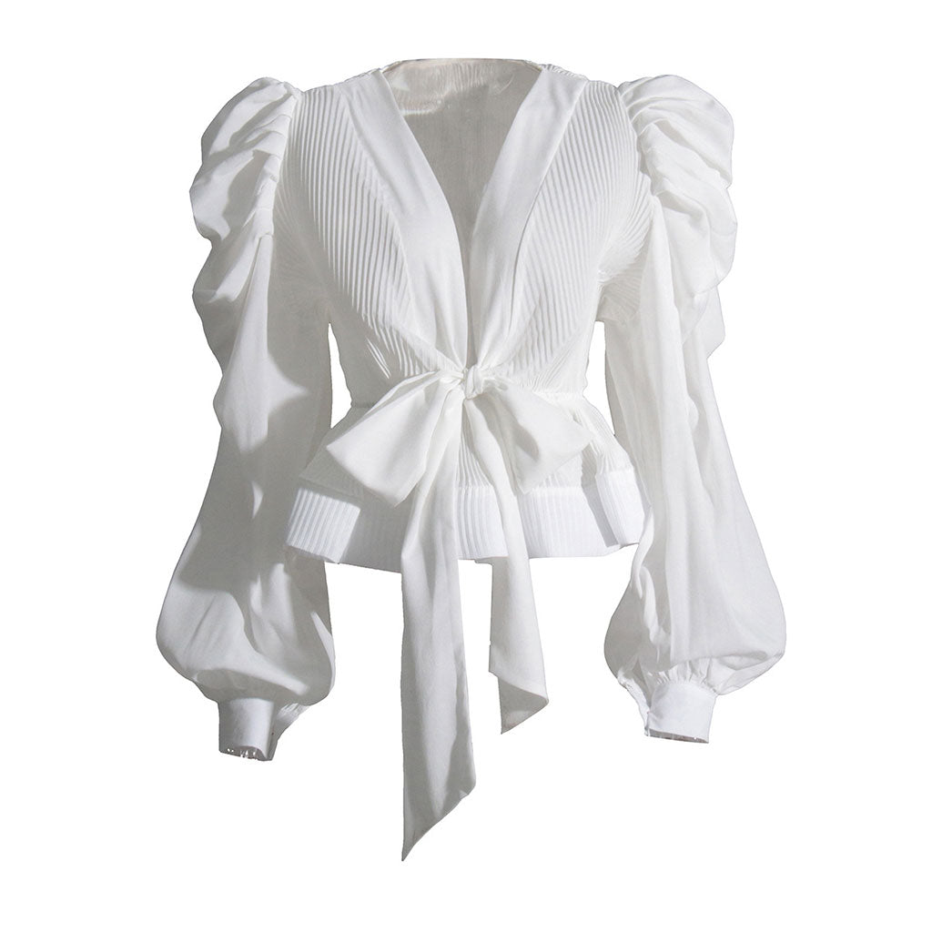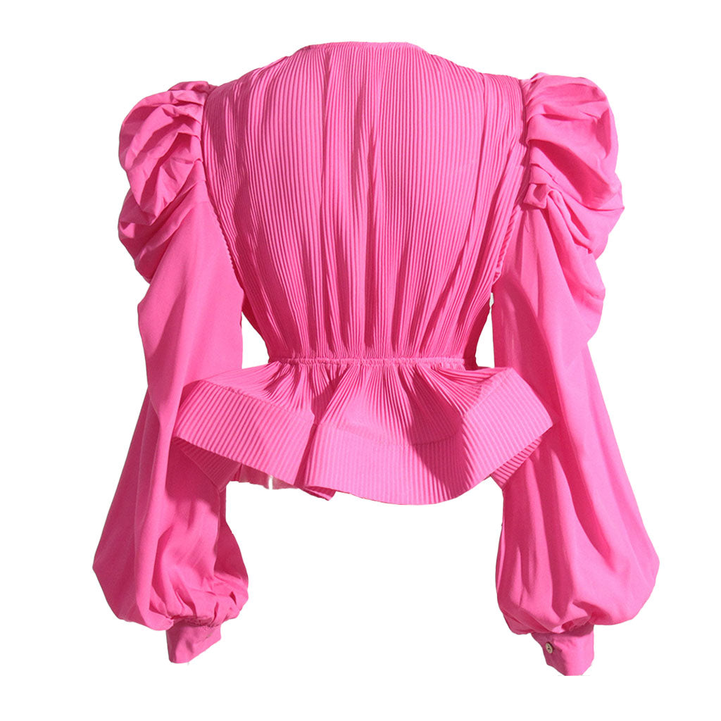 Dramatic Puff Sleeve V Neck Tie Front Pleated Chiffon Peplum Blouse