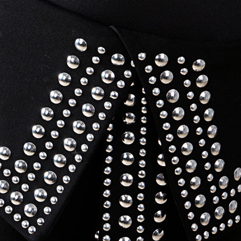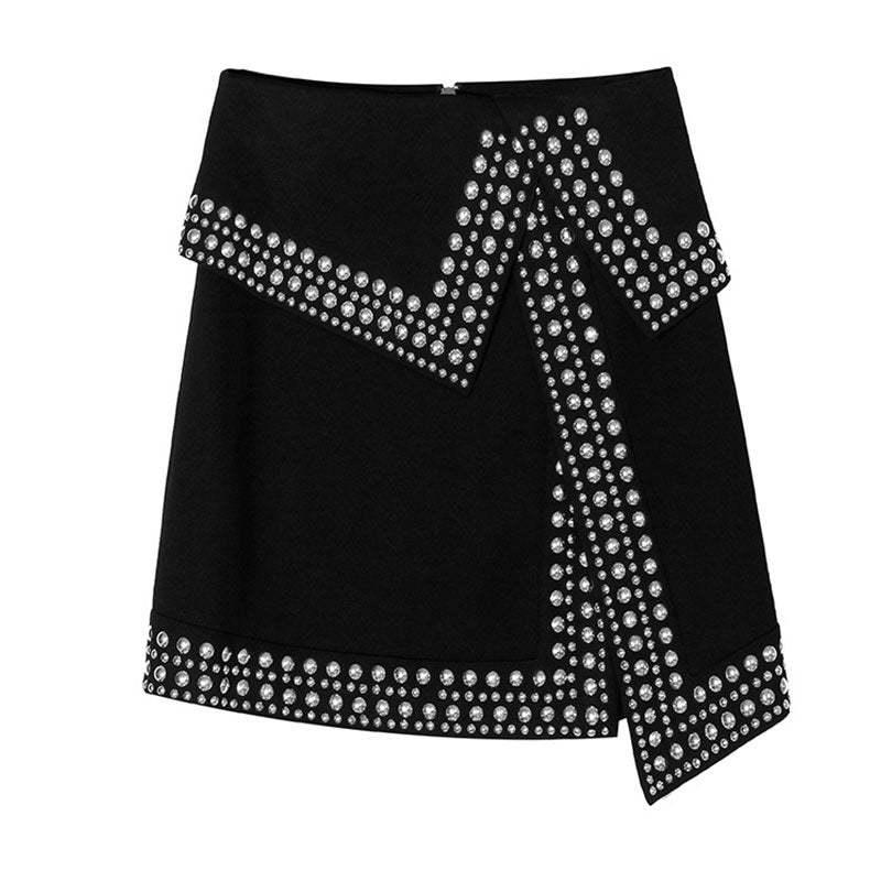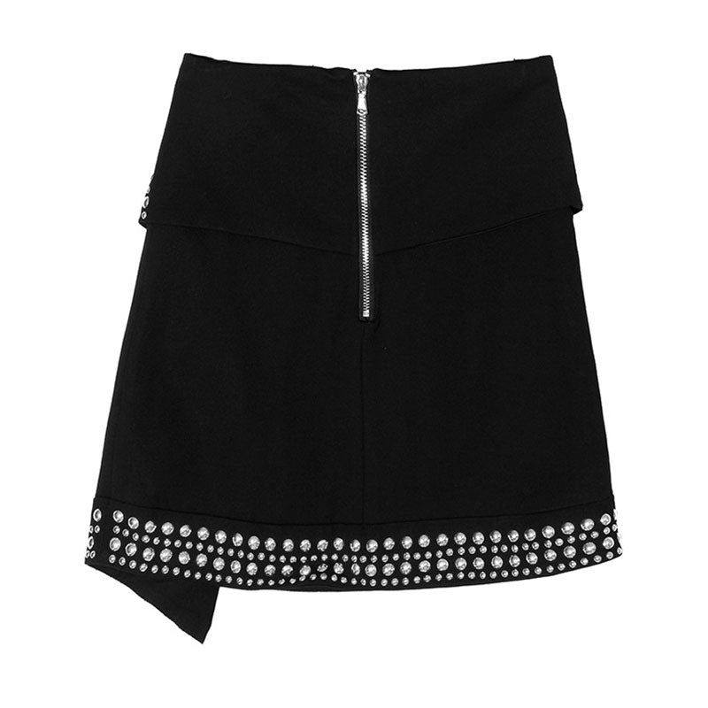 This adventurous A-line skirt strikes a perfect balance between Gothic glamour and designer sophistication. making it a must-have for any fashion-conscious wardrobe. Meticulously crafted with attention to detail. the silver-tone studs create the design with a unique and edgy feel. while the fold-over high waist and A-line shape create a feminine and flattering silhouette. With its practical exposed zip back closure. this skirt ensures a secure and comfortable fit. The irregular split at the front of the skirt adds an extra touch of drama. making it an ideal choice for women who want to make a bold statement.