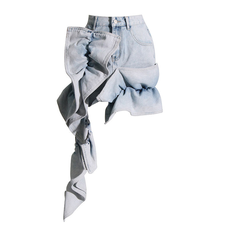 Eclectic High Waist Asymmetric Ruffle Detail Acid Wash Denim Mini Skirt