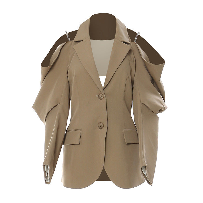 Edgy Chain Strap Off the Shoulder Cutout Lapel Collar Single Breasted Blazer