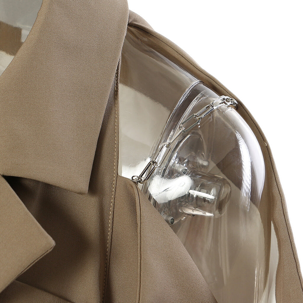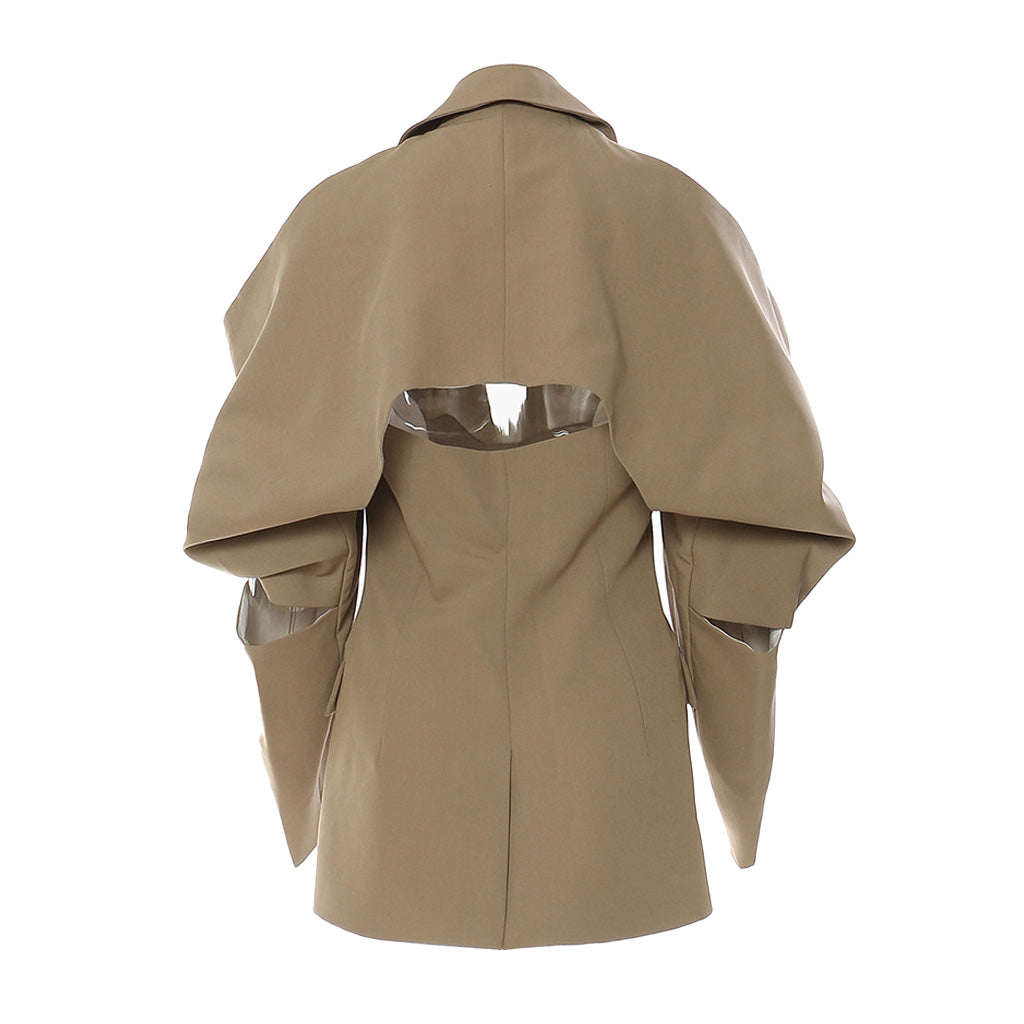 The off-the-shoulder blazer is a contemporary cut silhouette which achieves our designer label's bold shoulder aesthetic with chic pleats and slouchy draped sleeve tapering to the end. The structured suiting fabric forms an exaggerated sleeve with elbow cutouts and is enhanced by the silver-toned chain straps. Featuring lapel collars. single-breasted closure and flap front pockets. it is cut with princess seams to help shape a fitted nipped-in waist. The rear cutout also creates some breathing room which echoes the shoulder leaving heads turning as you walk. Unique and stylish. this is an intelligent juxtaposed compilation when traditional femininity meets masculinity for our LUXE's women.