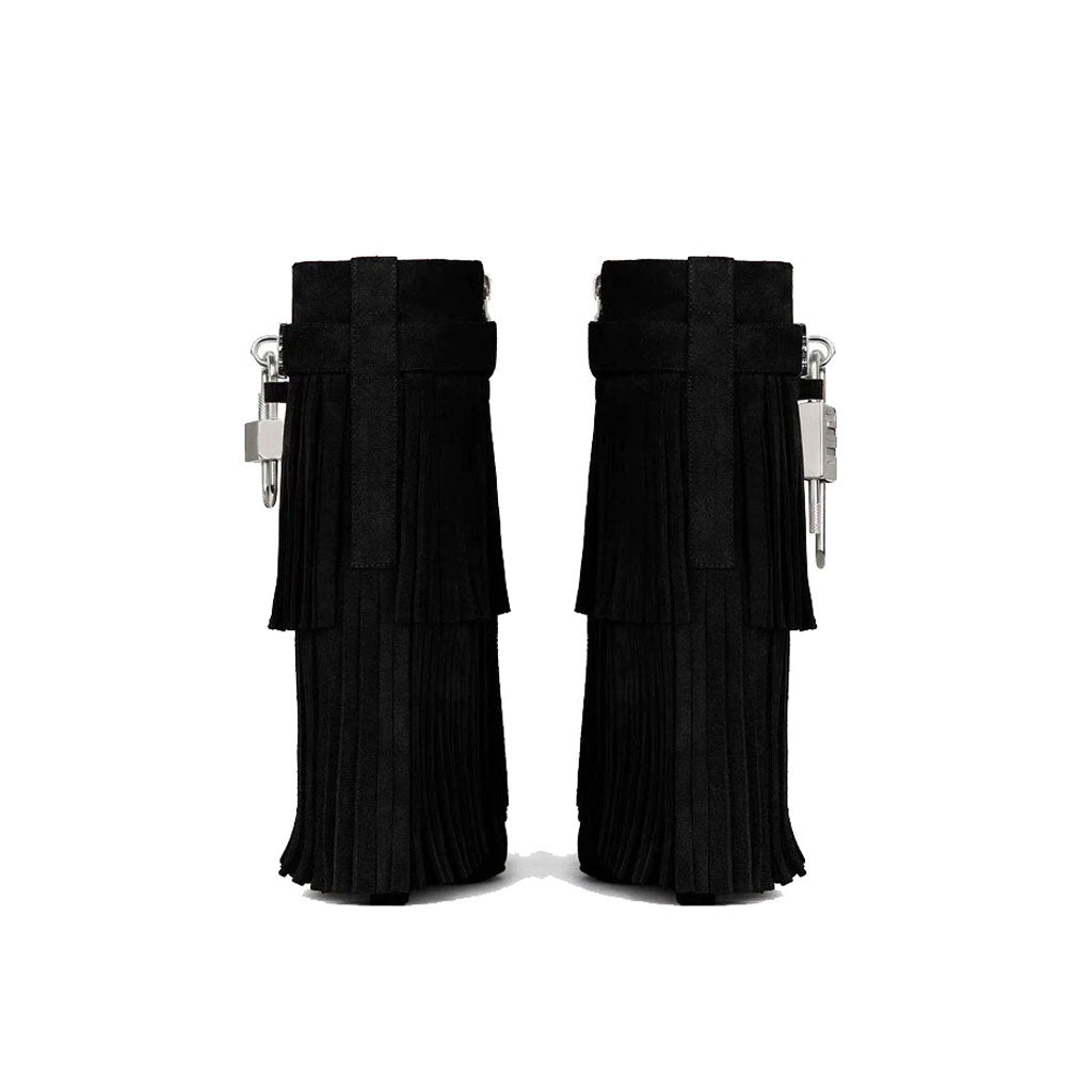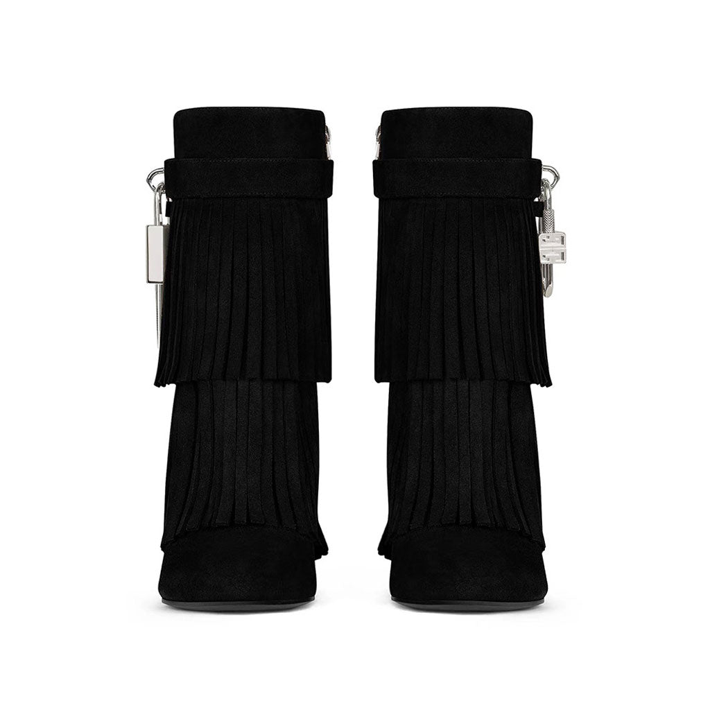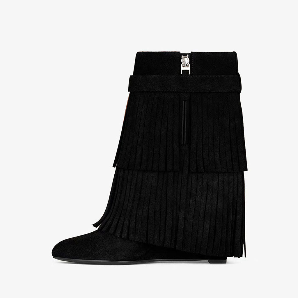 Edgy Metal Lock Layer Fringe Suede Wedge Heel Ankle Boots - Black