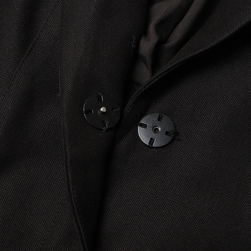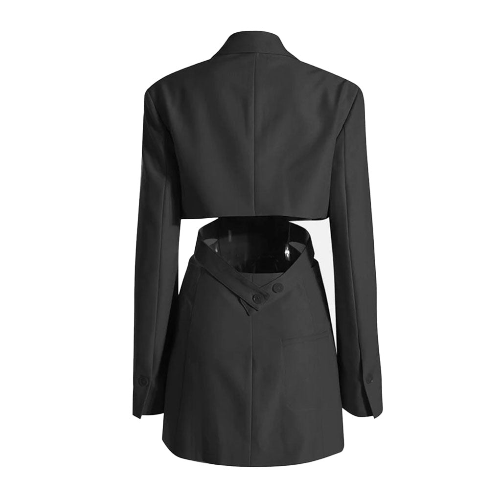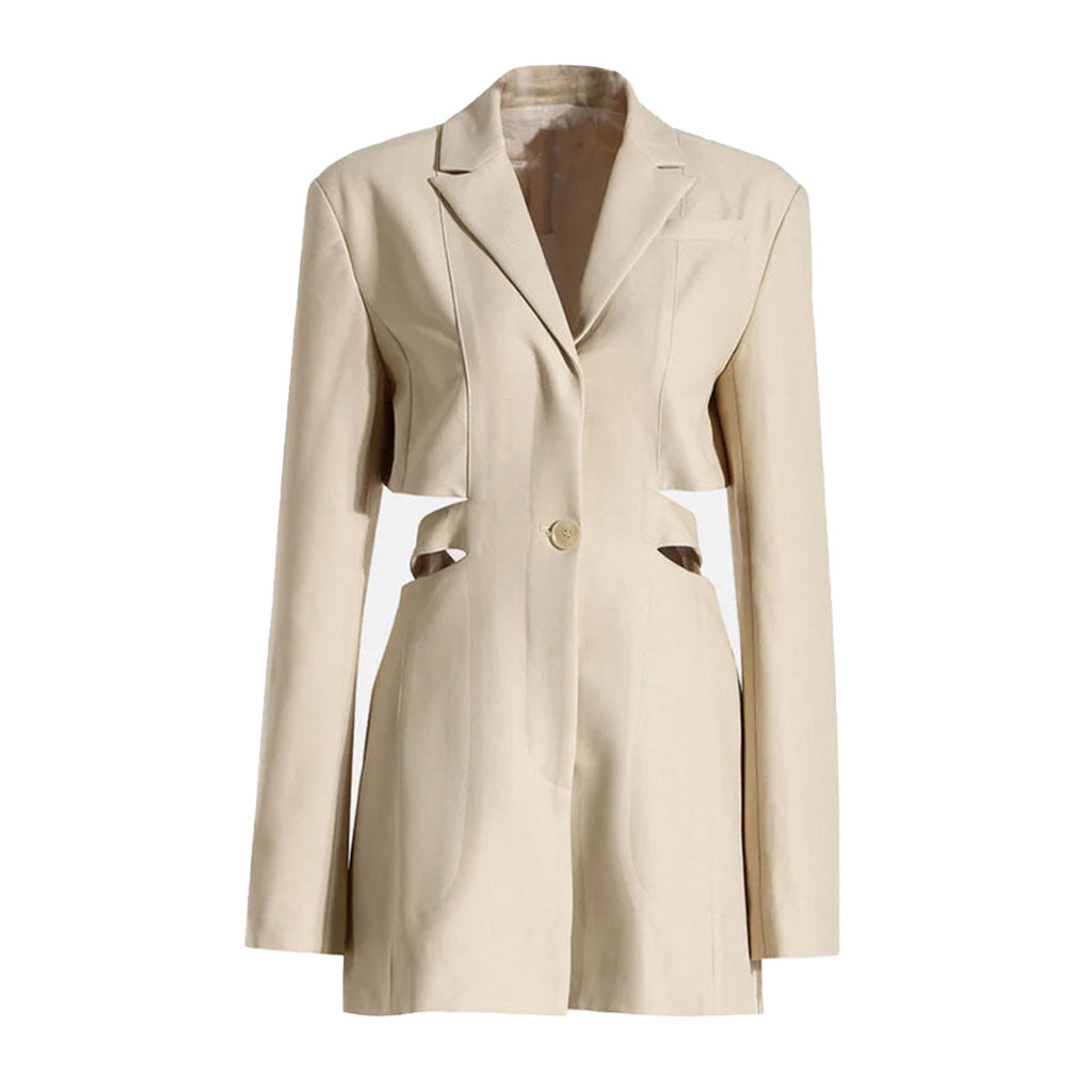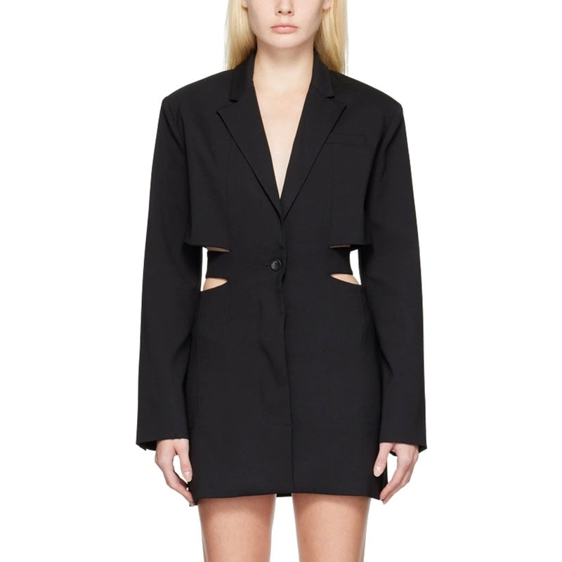 This daring fitted blazer is designed with a modern twist. featuring a unique cutout design at the waist and a chic belt butted at back for a flattering silhouette. Crafted with long sleeves and a visible single button closure. this designer blazer boasts a classic notched lapel collar and concealed buttons at the front placket for a sleek and bold finish. The shoulder pad design and the hip pocket are elegantly placed for added convenience and a touch of refinement. With its tailored longline design. this blazer is perfect for elevating any outfit - whether for a day at the office or a night out on the town. So. make a statement with our fashion-forward blazer and leave a lasting impression.