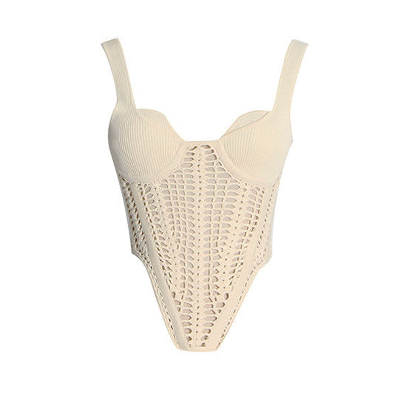 A chic crochet corset top adds mesmerizing quality to your outfit. The sleeveless corset style is knitted in a transparent crocheted look whilst stretch ribbed straps and back panel add a comfortable structure to the top that's flattering without being too constricting. The sweetheart neckline is distinguished with dual-layer for a perfect balance of modest and sexy. We love its dipped hem. tonal binding and exposed metal rear zip closure enhancing the sculpting fit. Match it with baggy jeans and chunky sneakers to imbue a hint of nonchalance into your cool spirit.