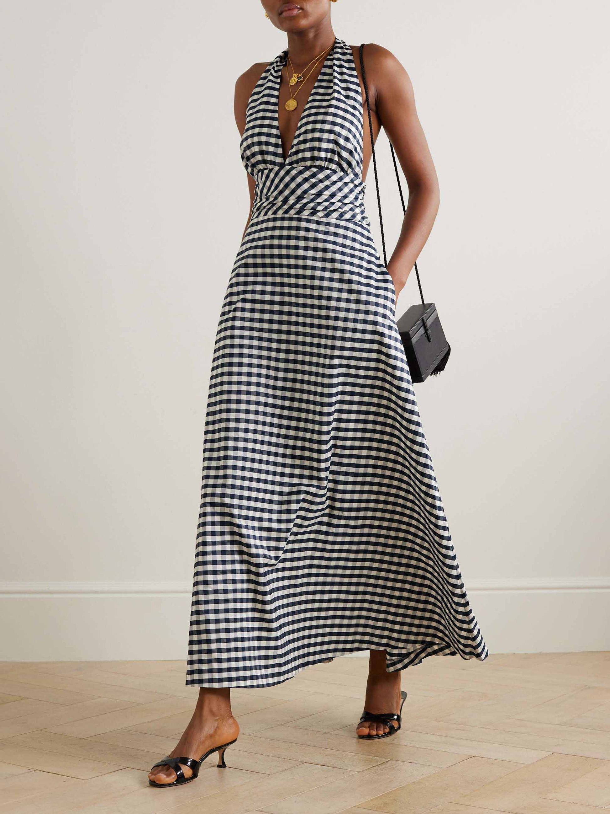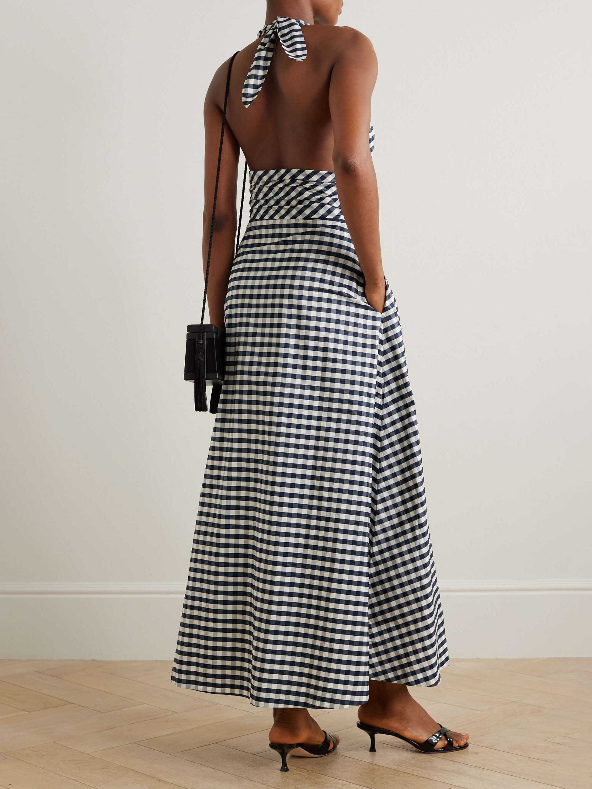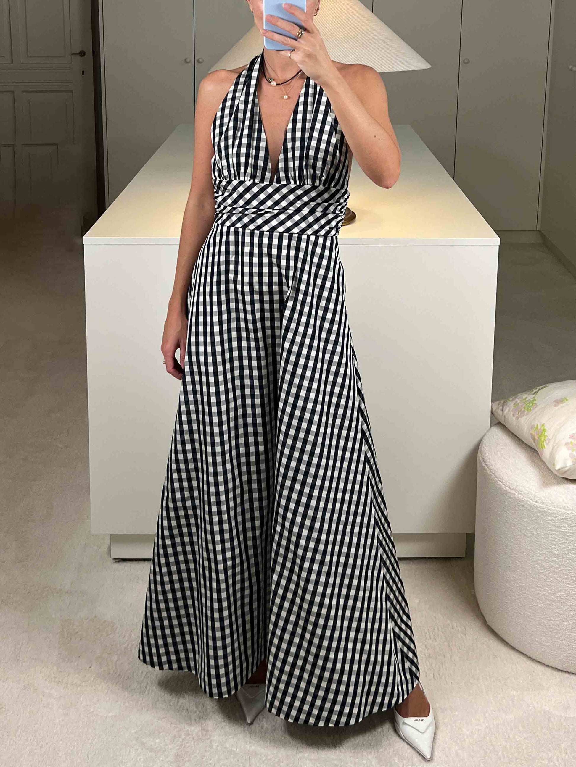 Elegant Plaid Halterneck Deep V-Neck Midi Dress