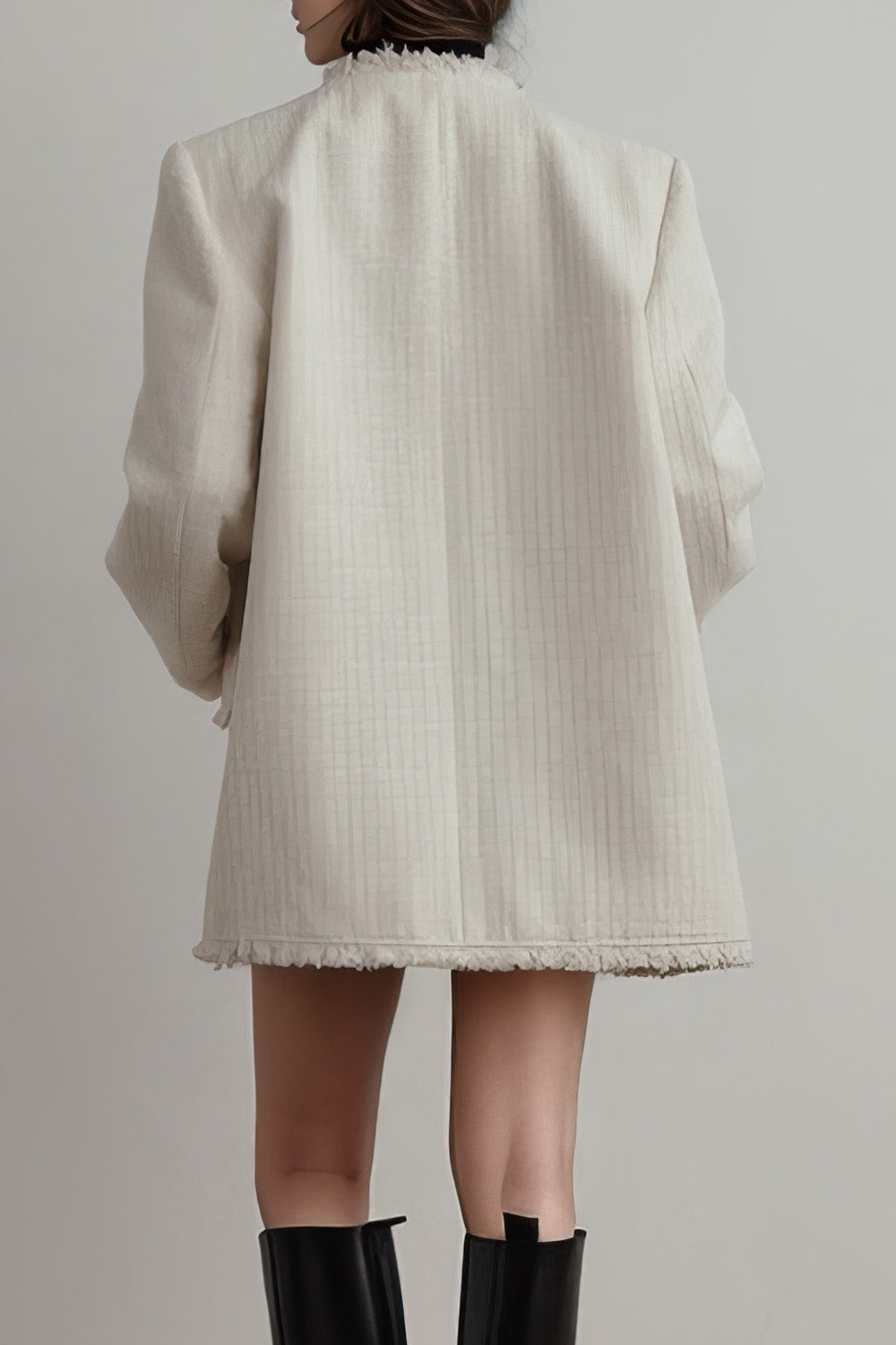 Its textured fabric and round neckline provide a sophisticated look. while the long sleeves and textured buttons are finished with a classic elegance. The fringe at the ends is the perfect finishing touch to this elegant garment.