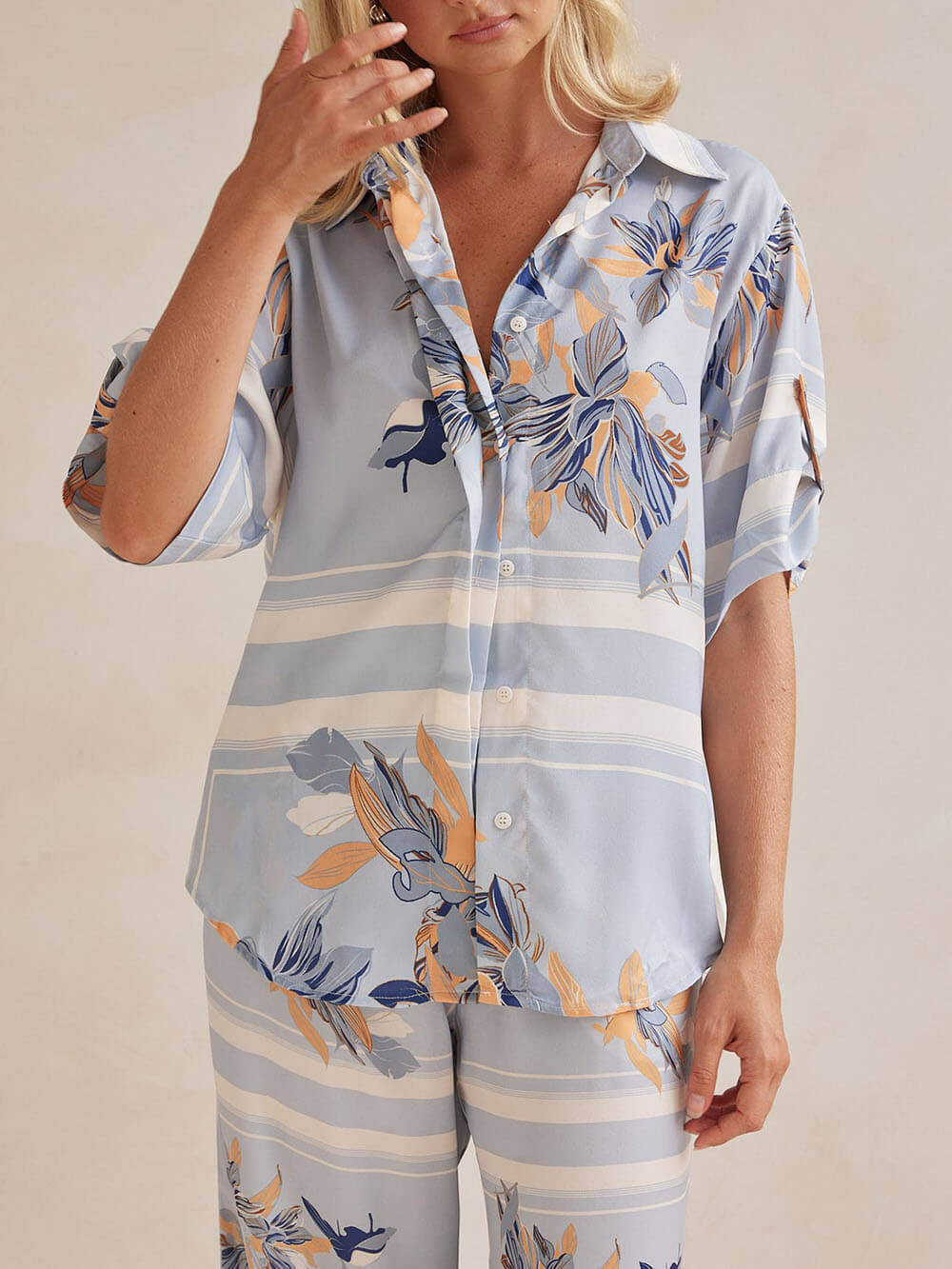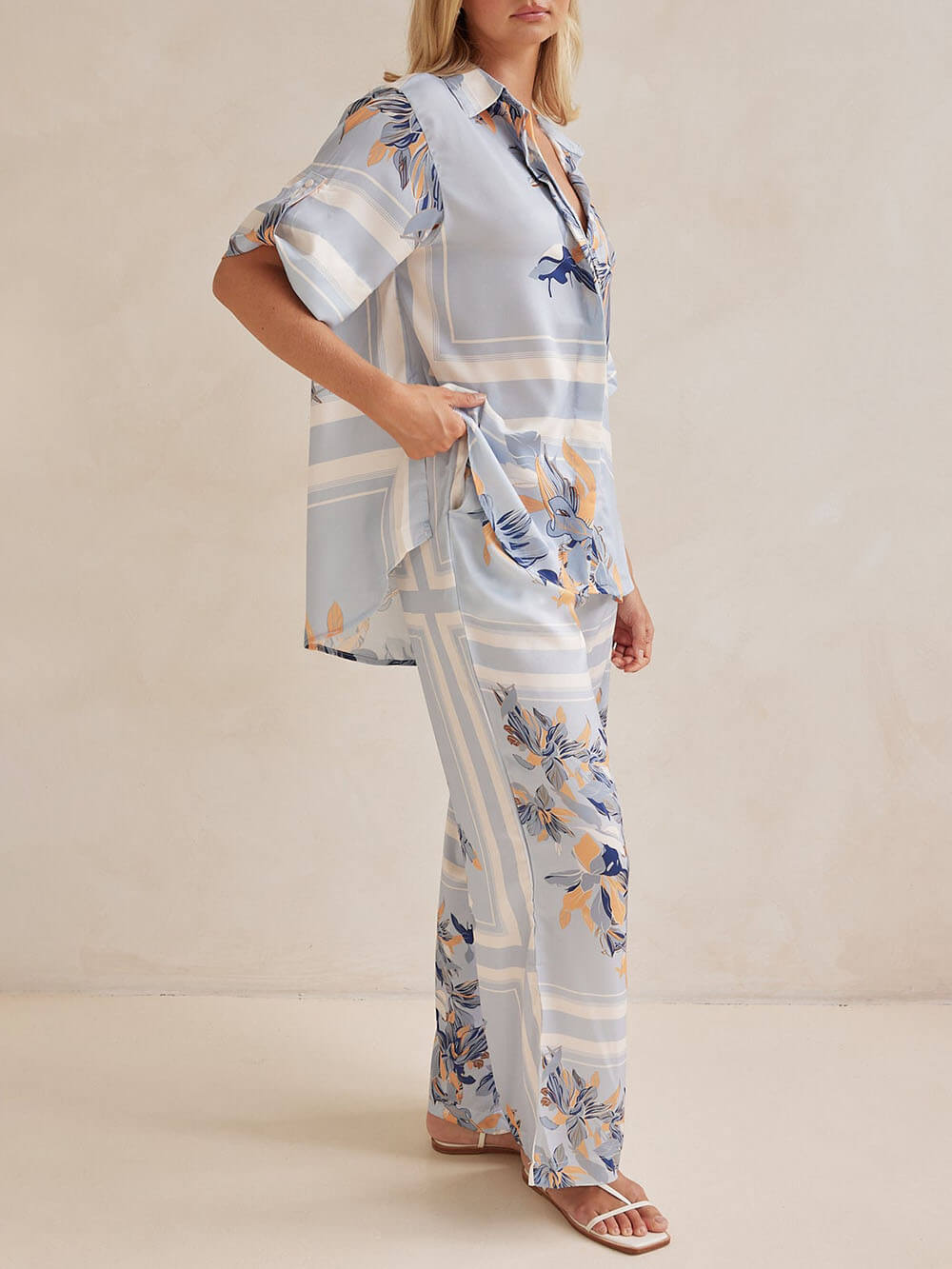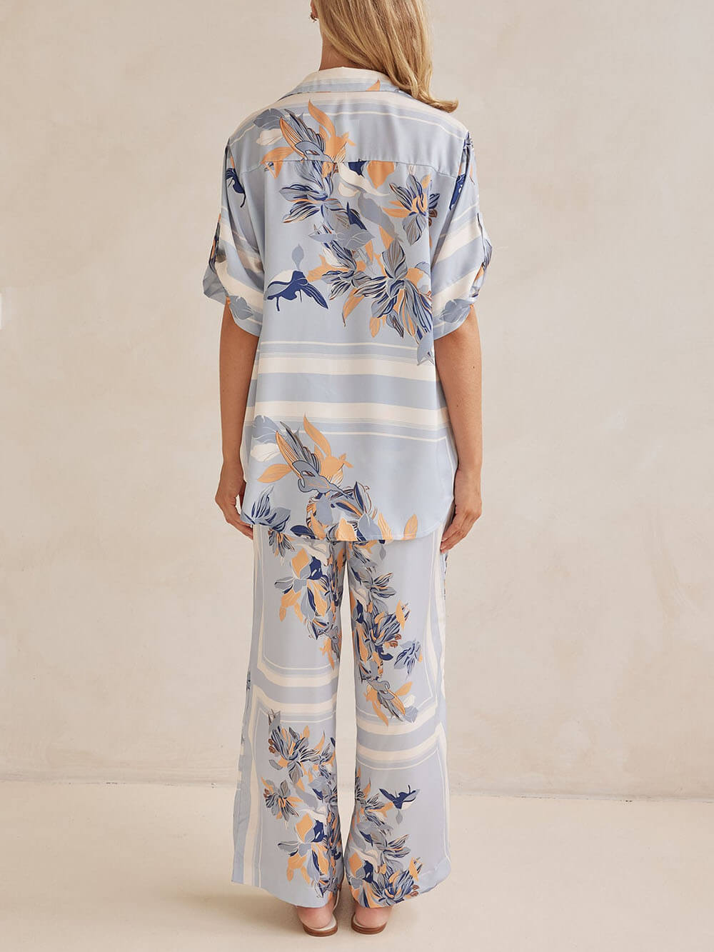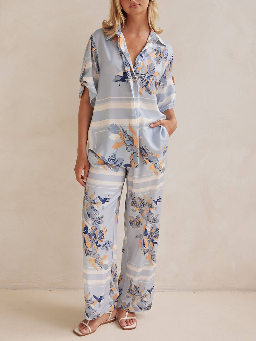 Perfect for casual outings. vacations. or just lounging at home. this shirt pairs well with the same printed straight-leg pants. effortlessly combining style and comfort. Pair with your favorite heels or jewelry. bag for a stylish and effortless look.