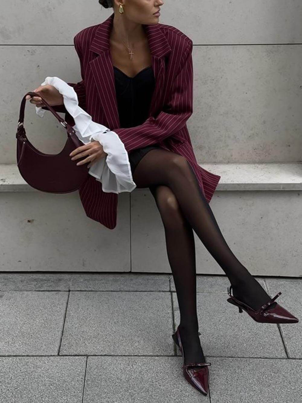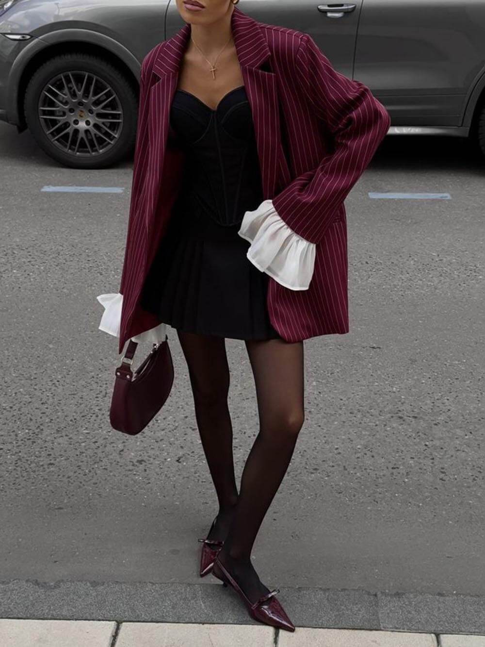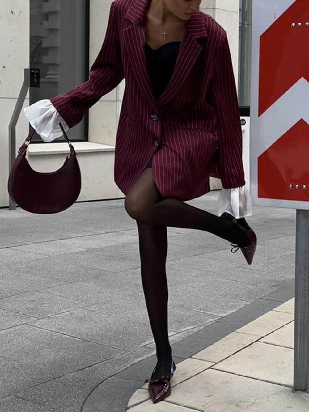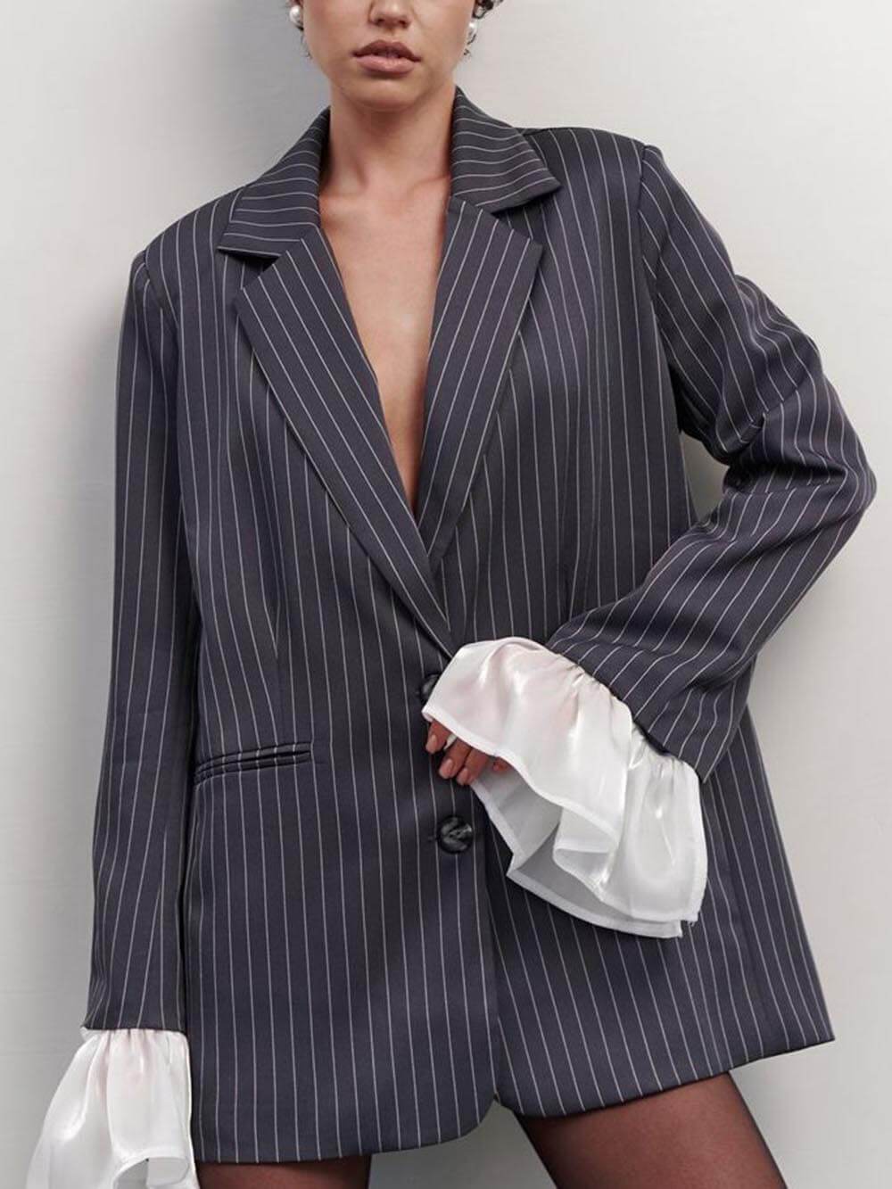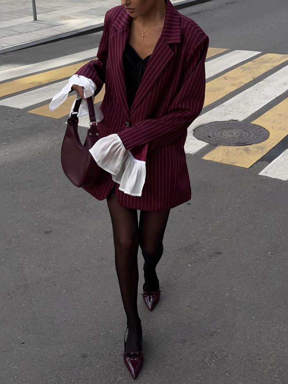 "Exquisite Lace Ruffles Striped Loose Blazer" Designed for comfortable warmth and elegant style. Combining fashion with function. this blazer features striped lace patchwork. which is both warm and versatile.