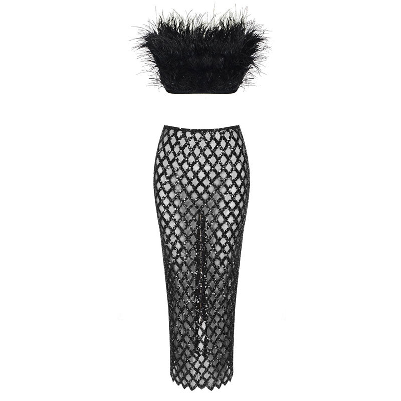 Fancy Faux Feather Trim Diamante Mesh High Rise Skirt Matching Set - Black