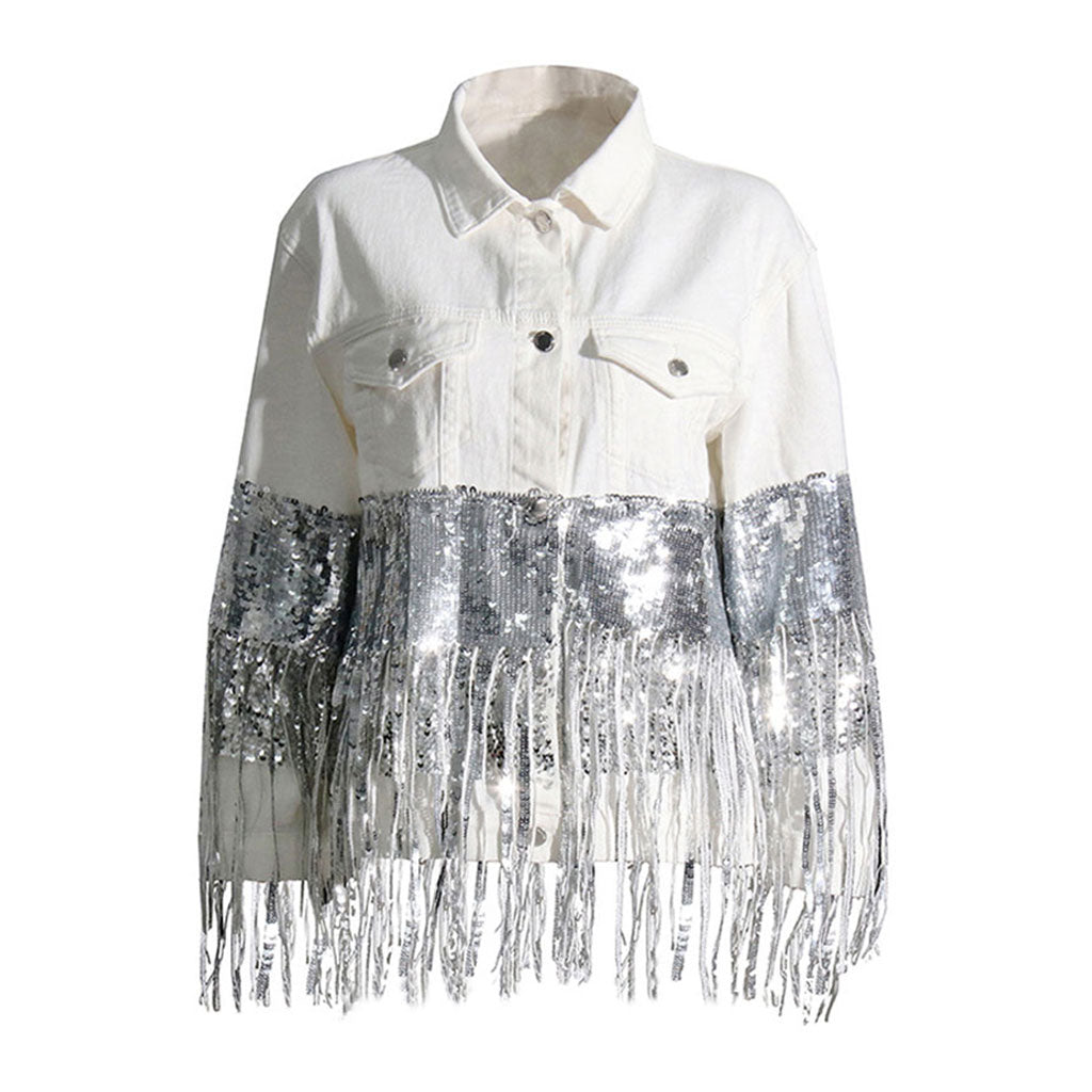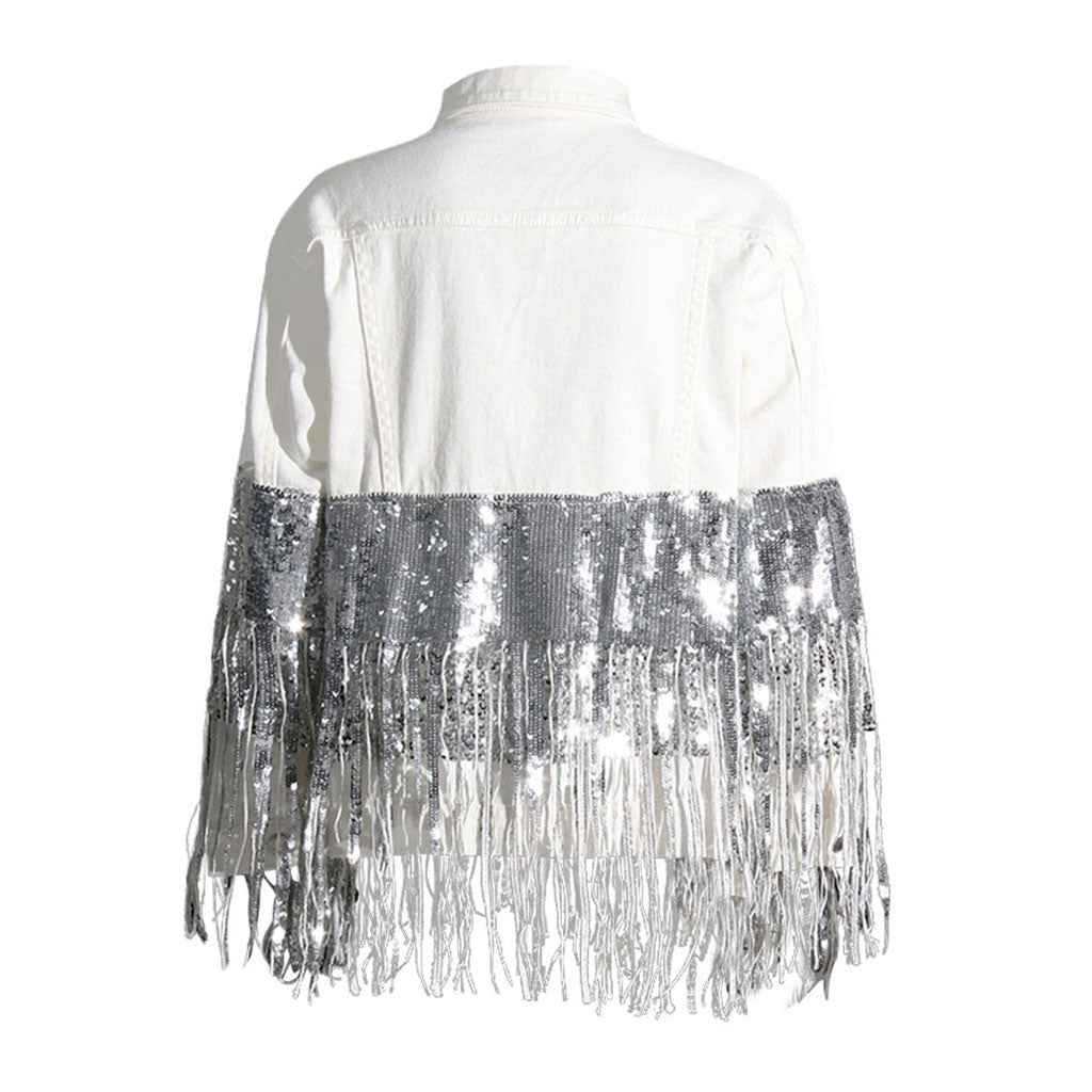 Flamboyant Collared Button Front Long Sleeve Sequin Fringe Denim Jacket