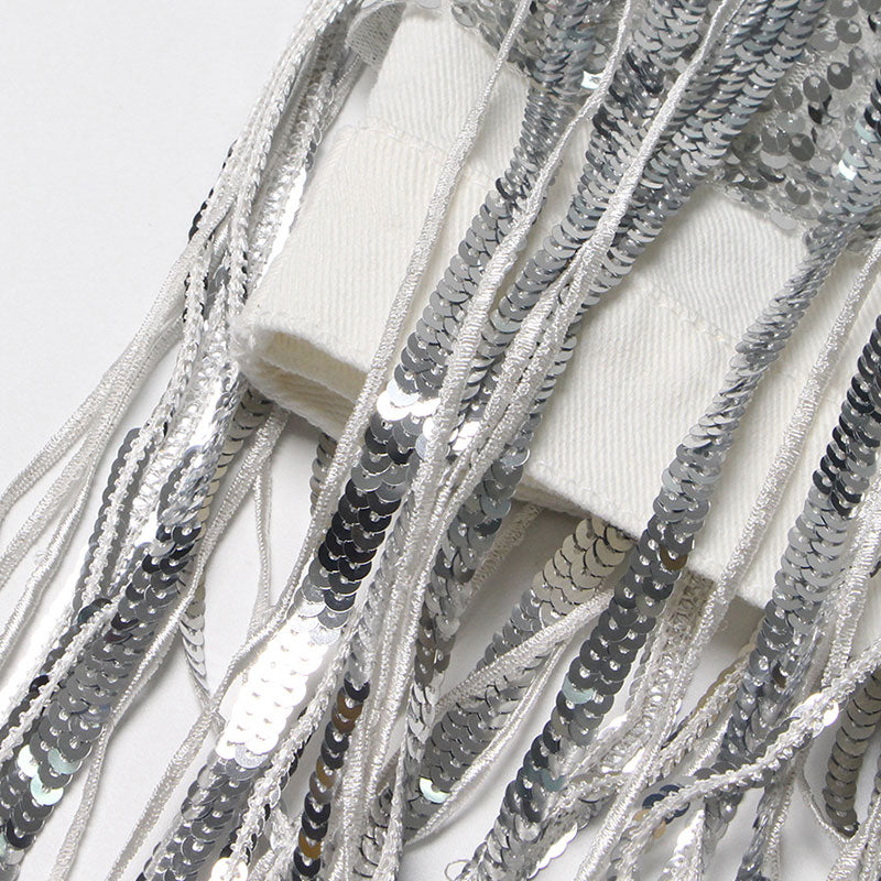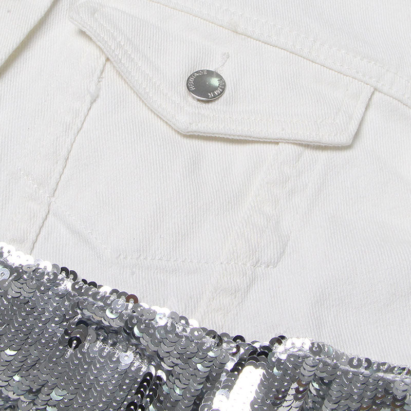 Slip into the sparkling embellished denim jacket and experience the magic of fashion come to life. This stunning designer jacket envelops you in a feeling of luxurious comfort and style. as the thick denim fabric and elegant design create a sense of effortless sophistication. The sequin fringes add a touch of playful charm. making you feel like the center of attention wherever you go. With its classic fold-over collar. flap patch pockets. and boxy silhouette. this jacket is the perfect blend of timeless elegance and modern creativity. Wear it with confidence and let the world see the beauty of your style.
