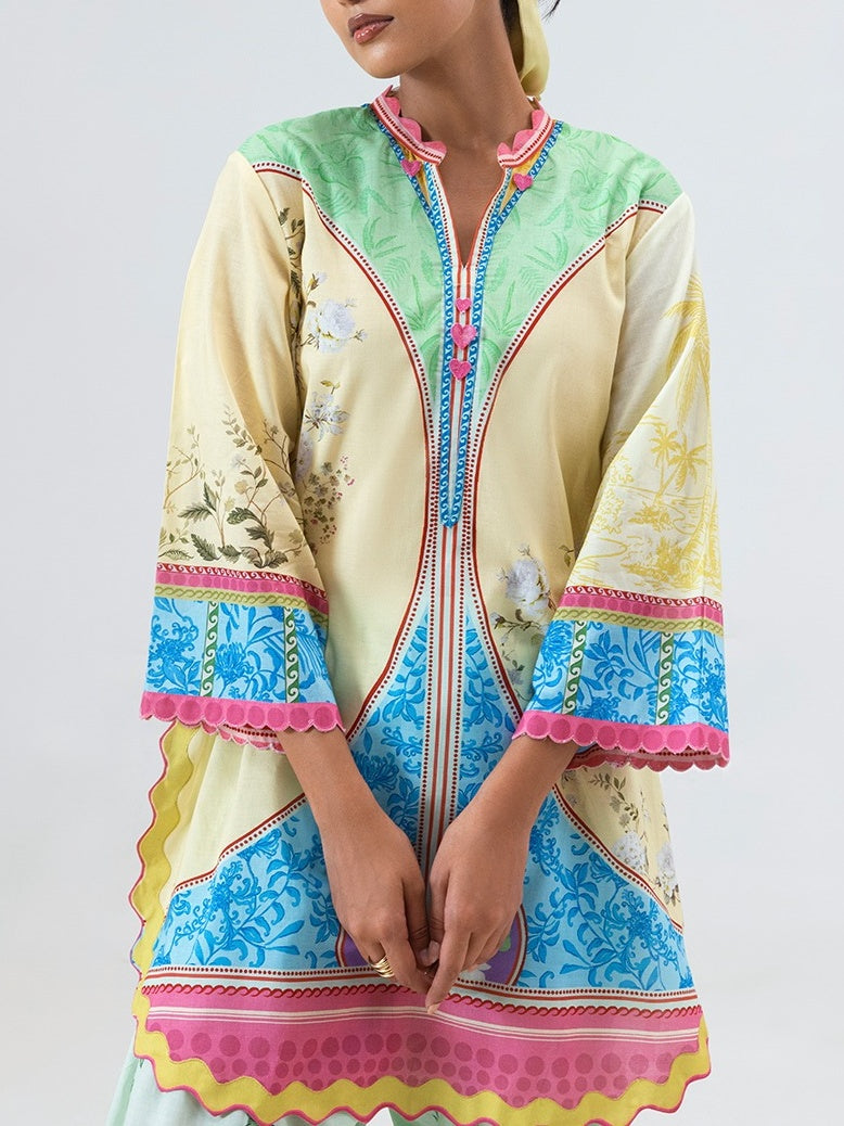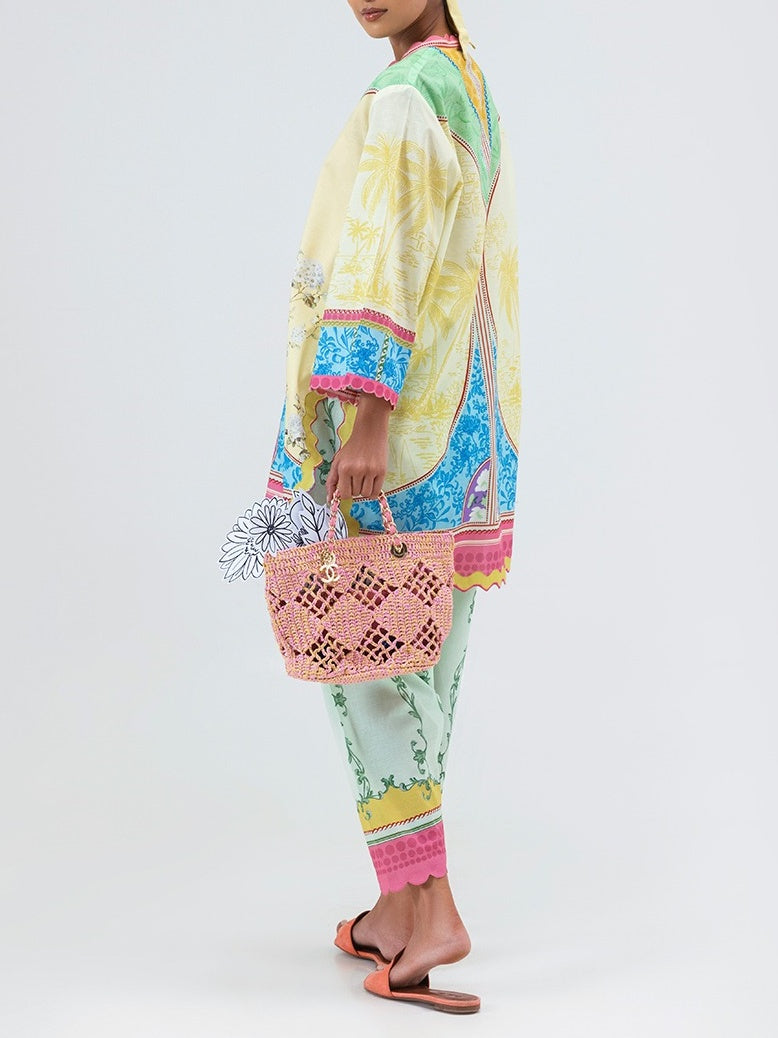 Intro:This set blends soft pastels and ethnic charm. The top. in creamy yellow. features floral prints. a green yoke. and scalloped trims. Paired with mint - green pants adorned with delicate vines and colorful borders. it exudes a bohemian vibe. Lightweight fabric ensures comfort. while the crochet bag adds a playful touch. Perfect for adding a whimsical. cultural - inspired flair to your wardrobe.