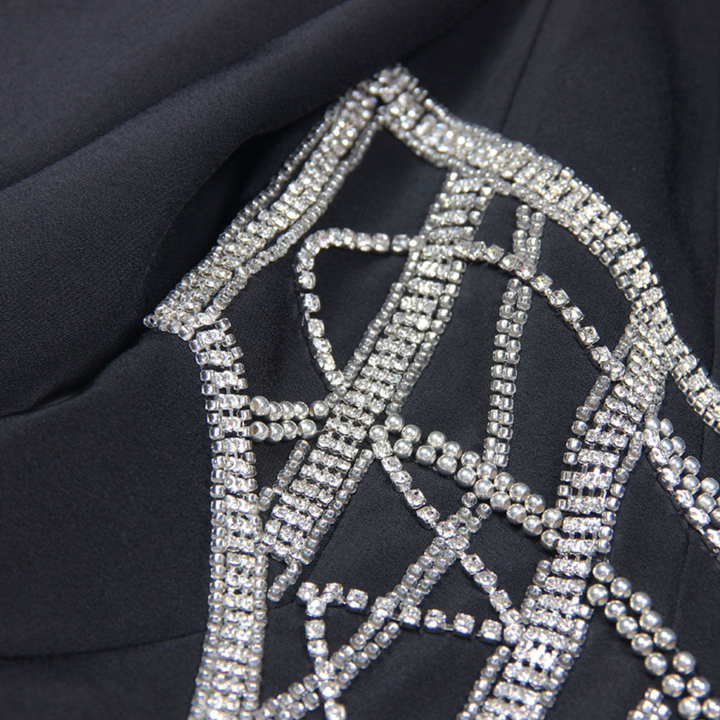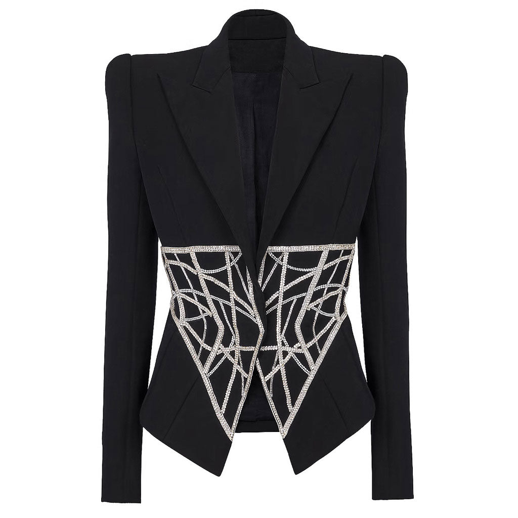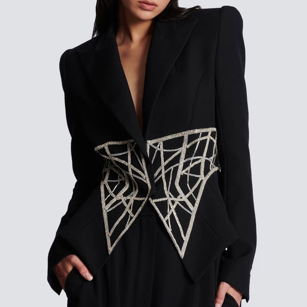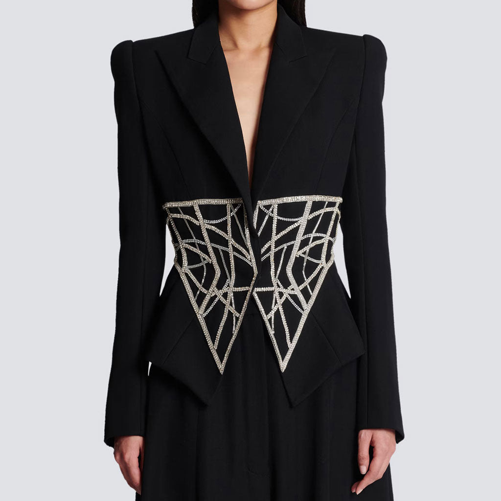 Glittered Crystal Corset Trim Peak Lapel Long Sleeve One Button Tailored Blazer