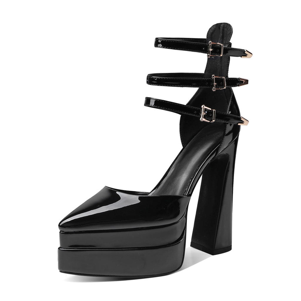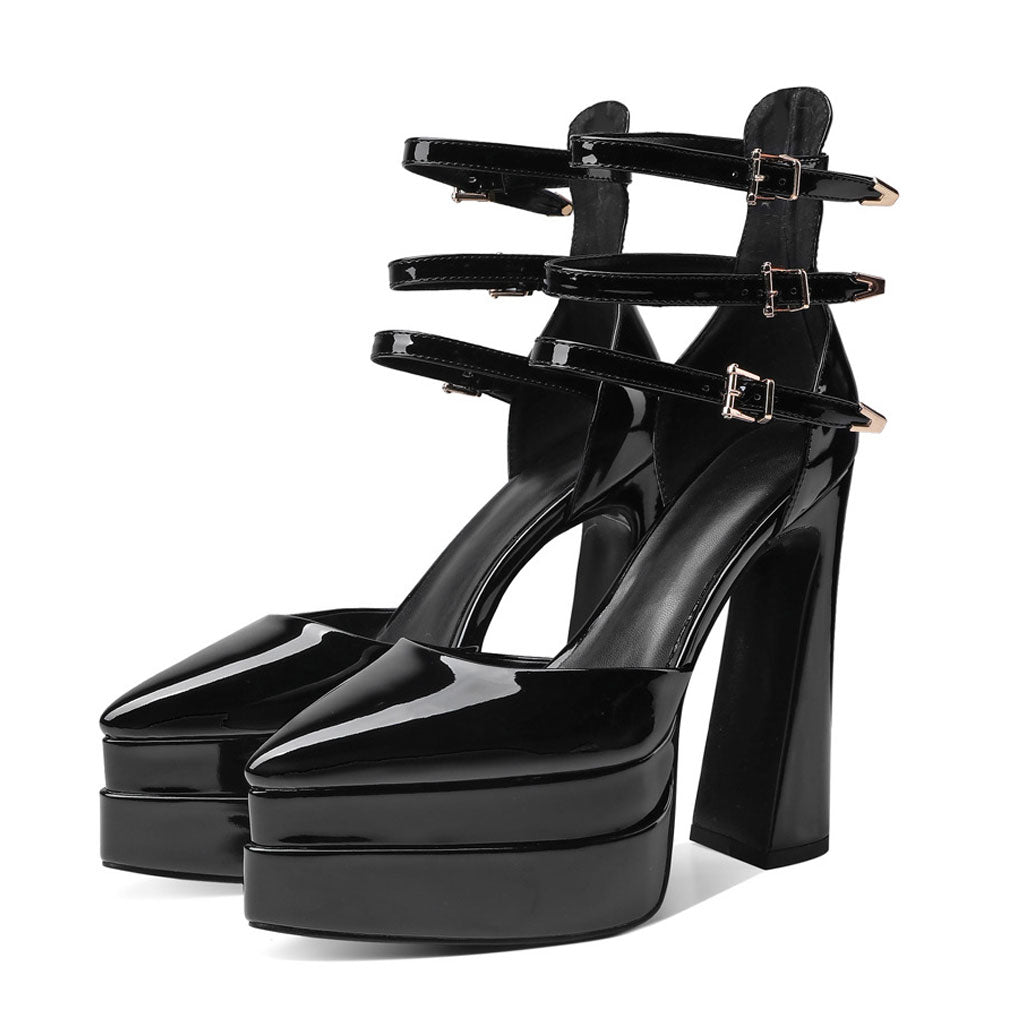 Glossy Pointed Toe Platform Block Heel Ankle Strap Pumps - Black