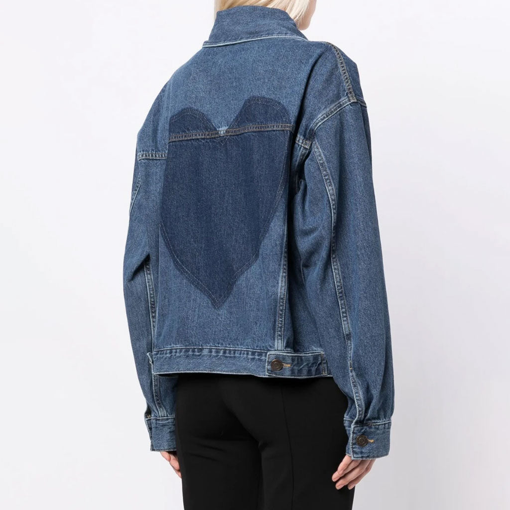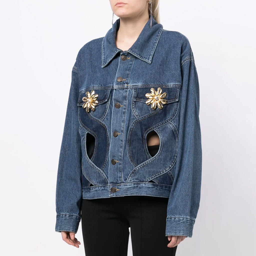 Contrast elegance and edginess with the chic boxy denim jacket. The gold-tone flower accents add a hint of refined charm. while the contrast love-shaped patchwork on the back and the daring cut-out front creates a striking and daring visual contrast. Crafted from high-quality denim. this unique designer jacket features a pointed flat collar. front buttoned placket for convenience and drop sleeves that add a contemporary edge to the overall style. The unique combination of different elements makes this jacket a standout piece. perfect for adding flair to any outfit.