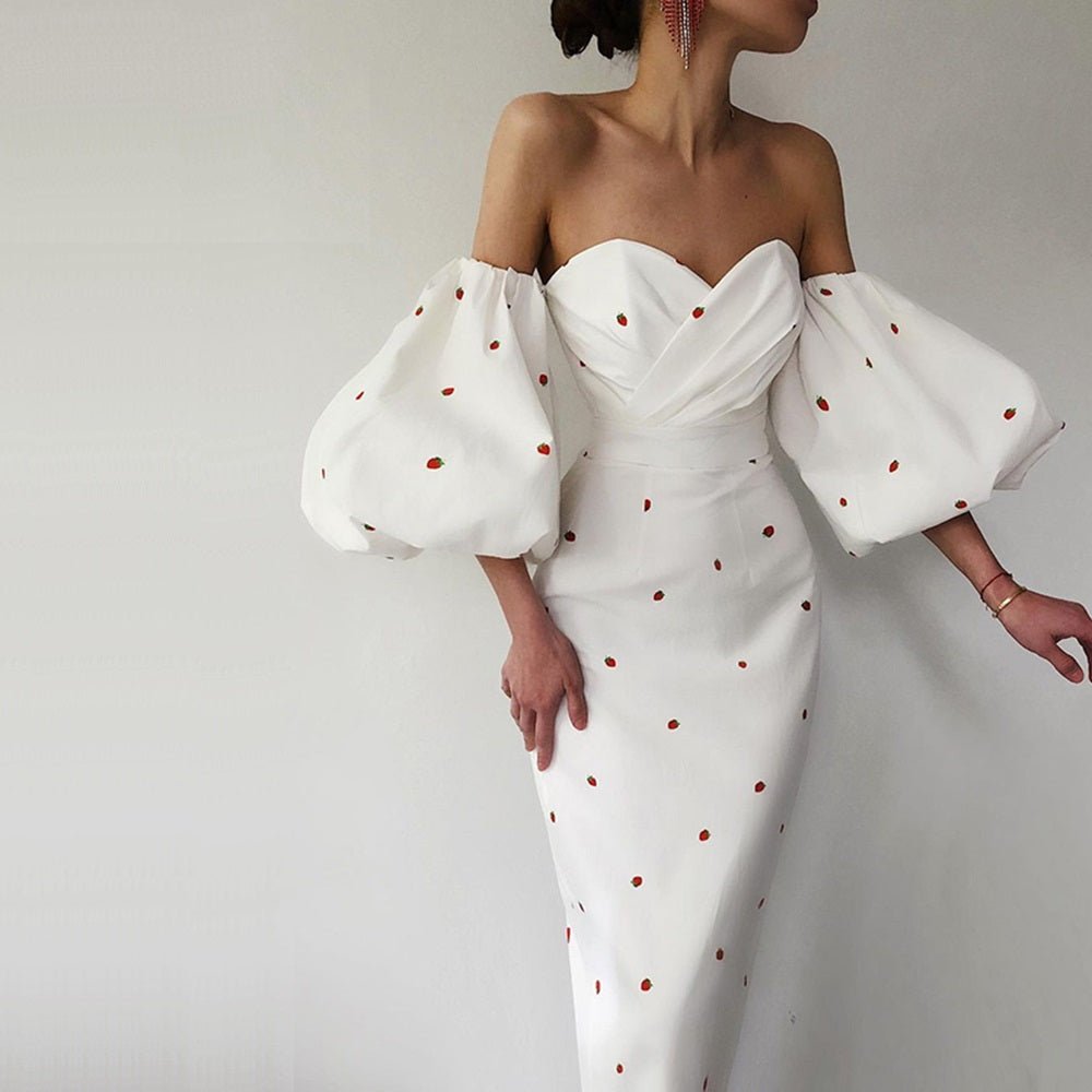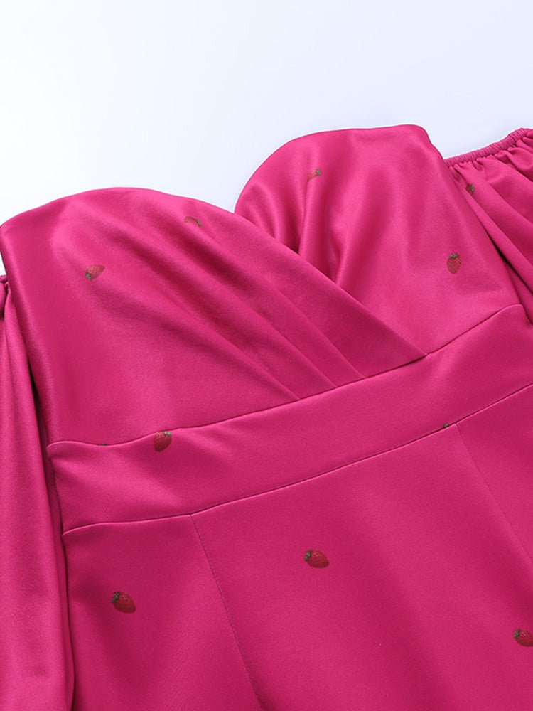 This elegant style combines contemporary and vintage silhouettes with a playful strawberry pattern.