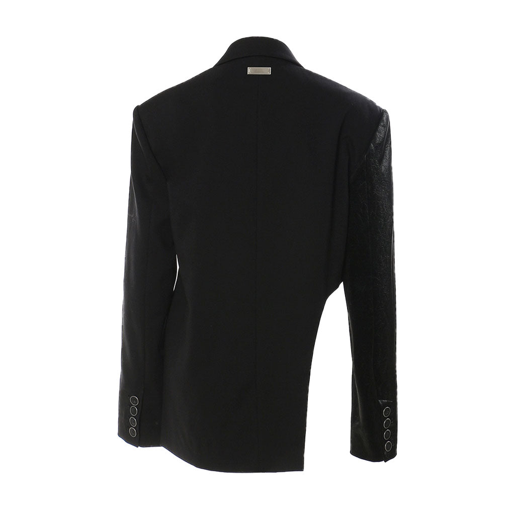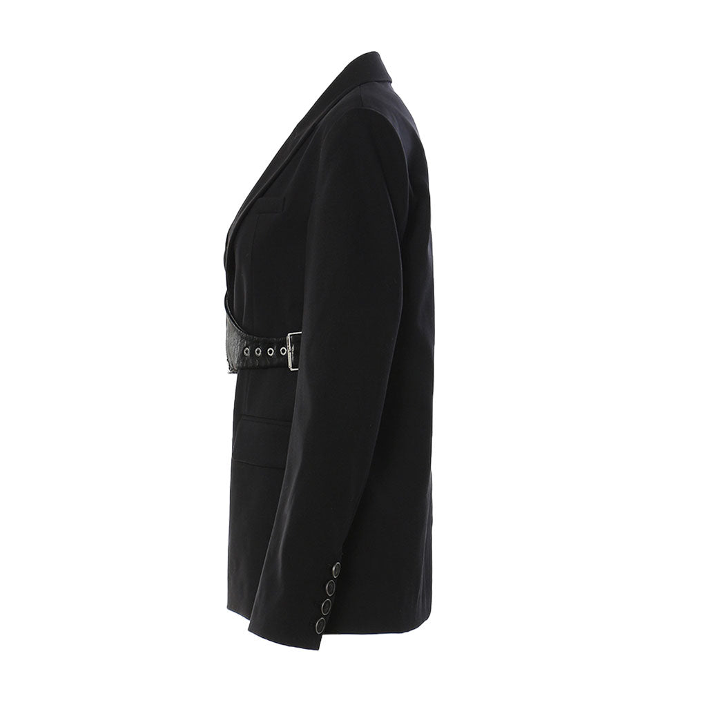 Chic designer blazer is all you need this season! A contemporary masterpiece combines sleek sophistication with edgy deconstruction. With its lapel collar. long sleeves. zipper accents. and fastening belt. this asymmetric jacket exudes urban elegance and avant-garde style. making it a standout addition to any wardrobe. The juxtaposition of smooth PU leather and quality fabric creates a dynamic visual contrast. A fastening buckle belt cinches the waist at side. creating a feminine silhouette. Whether paired with tailored trousers for a smart office look or worn over a slip dress for a night out on the town.
