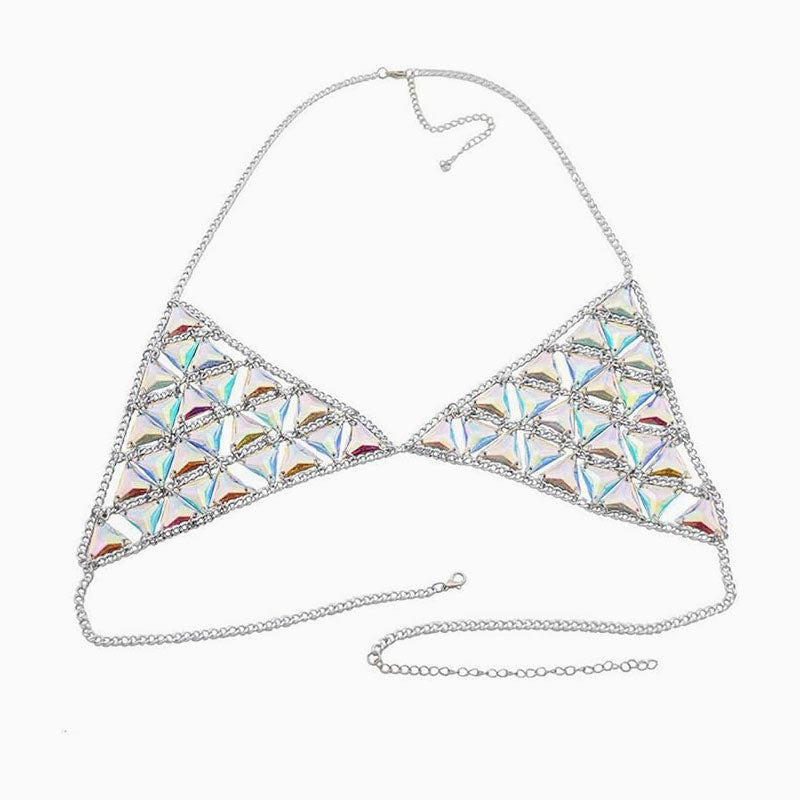 Iridescent Halter Open Back Acrylic Triangle Link Body Chain Bra Top