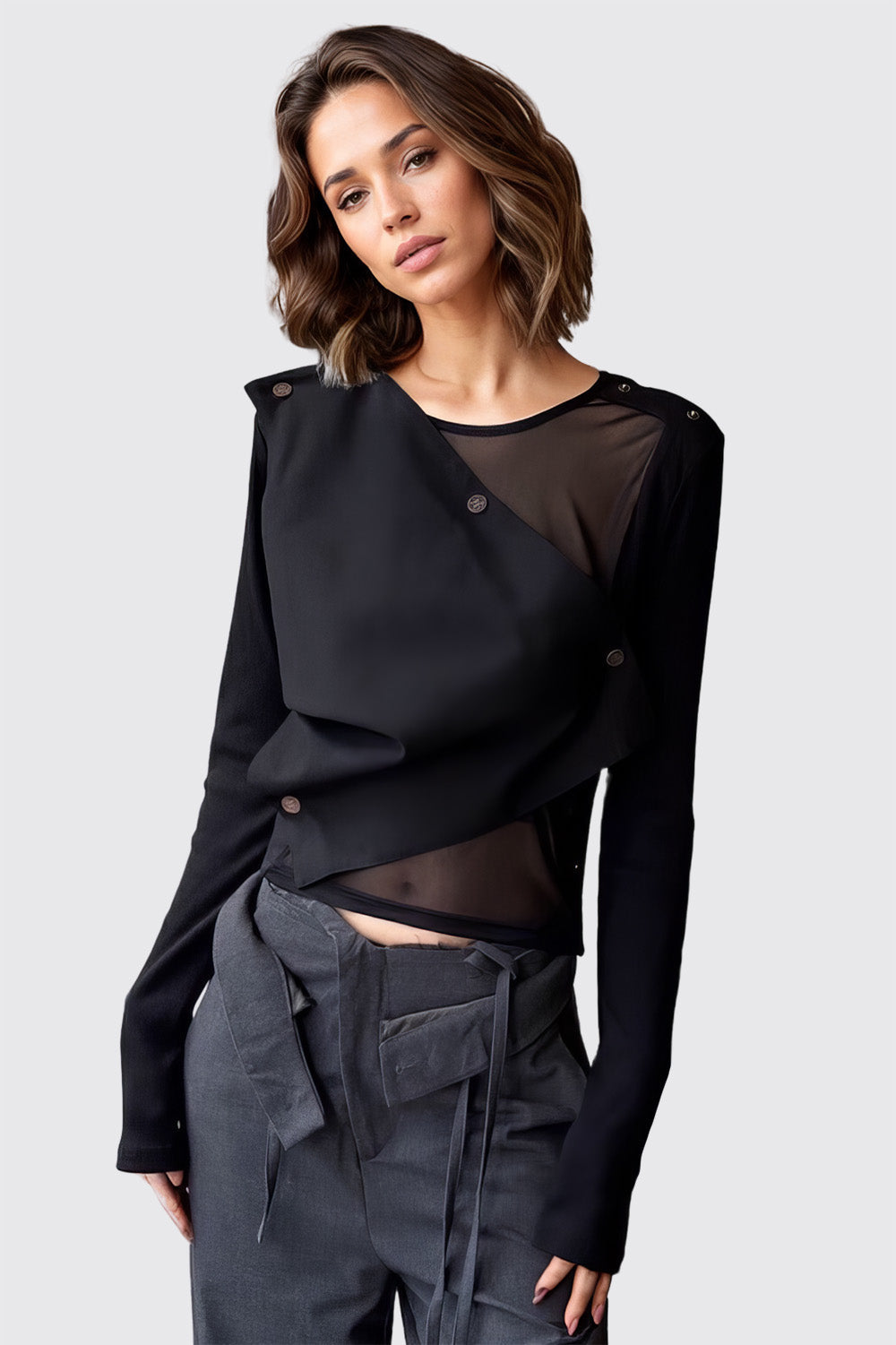 This Irregular Mesh Top is designed for unique style. Its large. asymmetrical collar provides comfortable coverage of the left shoulder. while small. round snap-buttons add an elegant touch. A sheer panel with long sleeves makes this top a fashionable and versatile addition to your wardrobe.