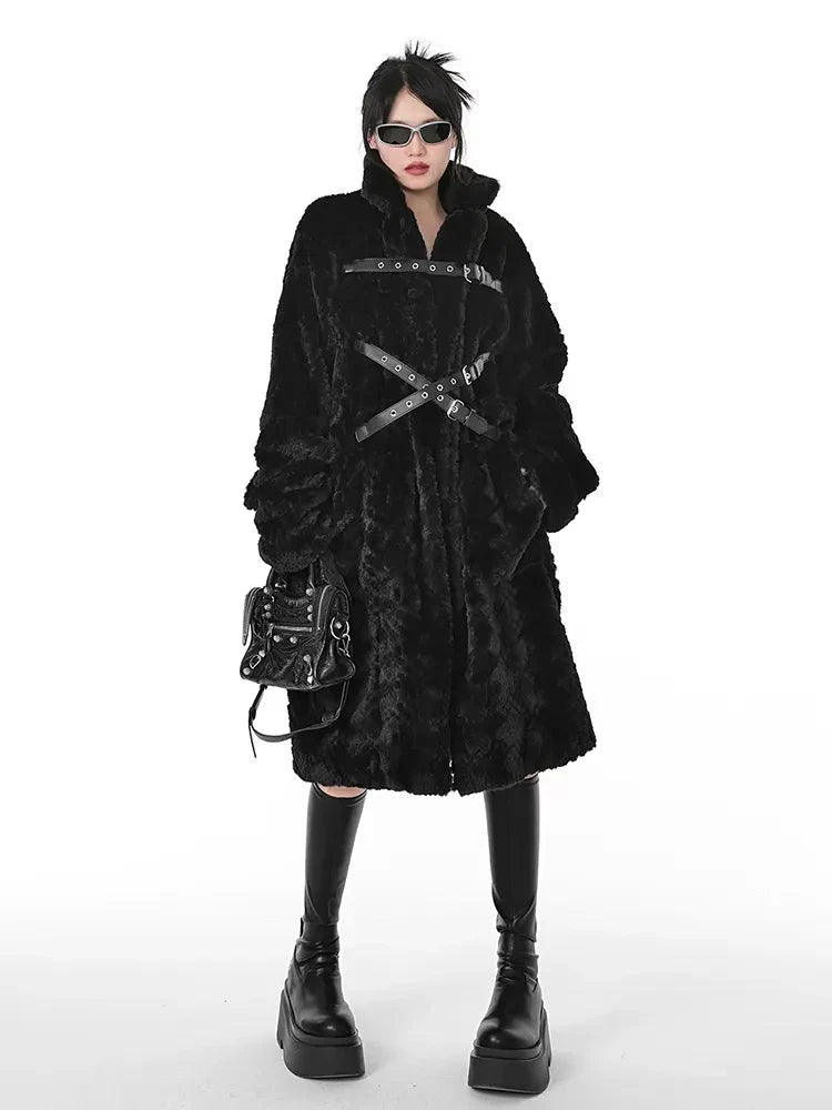 This winter. stay warm and stylish with our Punk Style Long Black Faux Fur Coat for women. Its punk style design adds edge to any outfit. while the faux fur keeps you cozy. Made from high-quality materials. this coat is a must-have for any fashionable woman's wardrobe.