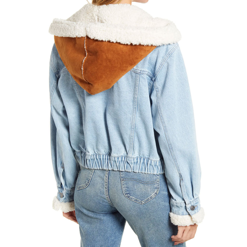 Having a crop profile with faux-sherpa lining. this luxury denim jacket is so cool and effortless. Crafted with denim. faux sherpa. and imitated suede. this unique coat has a hooded silhouette that features a lapel collar neckline. long sleeves with buttoned cuffs and drop shoulders. a single-breasted closure. oversized flap pockets at front. and ended up with an elastic hem. Match it with a basic top. a pair of jeans and a pair of sneakers for a trendy street outfit. Our designer clothes collection also brings out a range of stylish denim jackets for women.