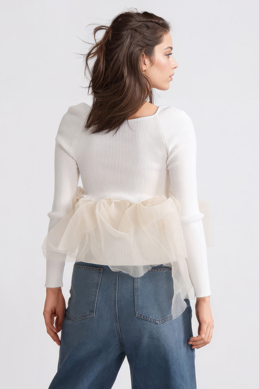 This ribbed long sleeve top features a sweetheart neckline and unique mesh detail. Crafted with a stretchy fabric. this top is both stylish and comfortable. Perfect for both day or night looks.
