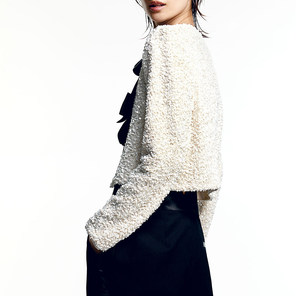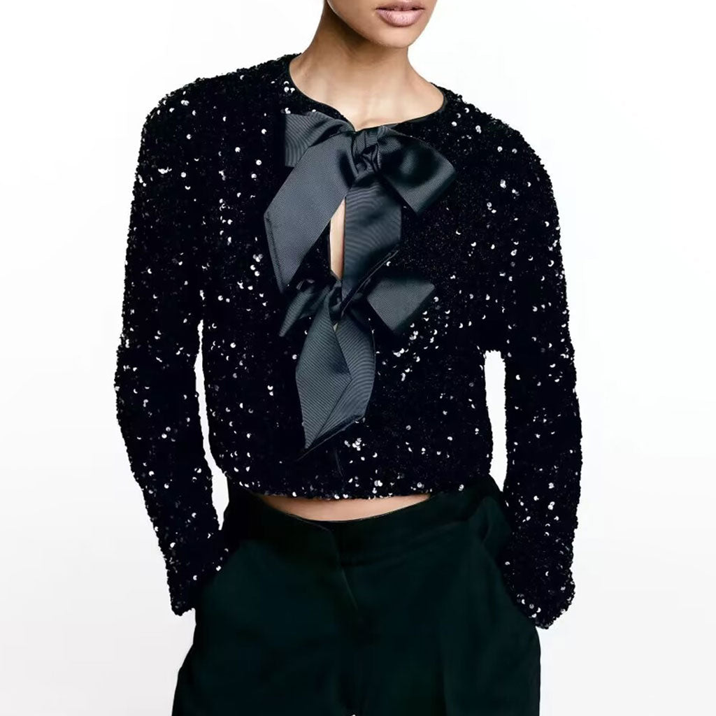 Luxury Big Bow Tie Crew Neck Long Sleeve Sequin Velvet Crop Jacket