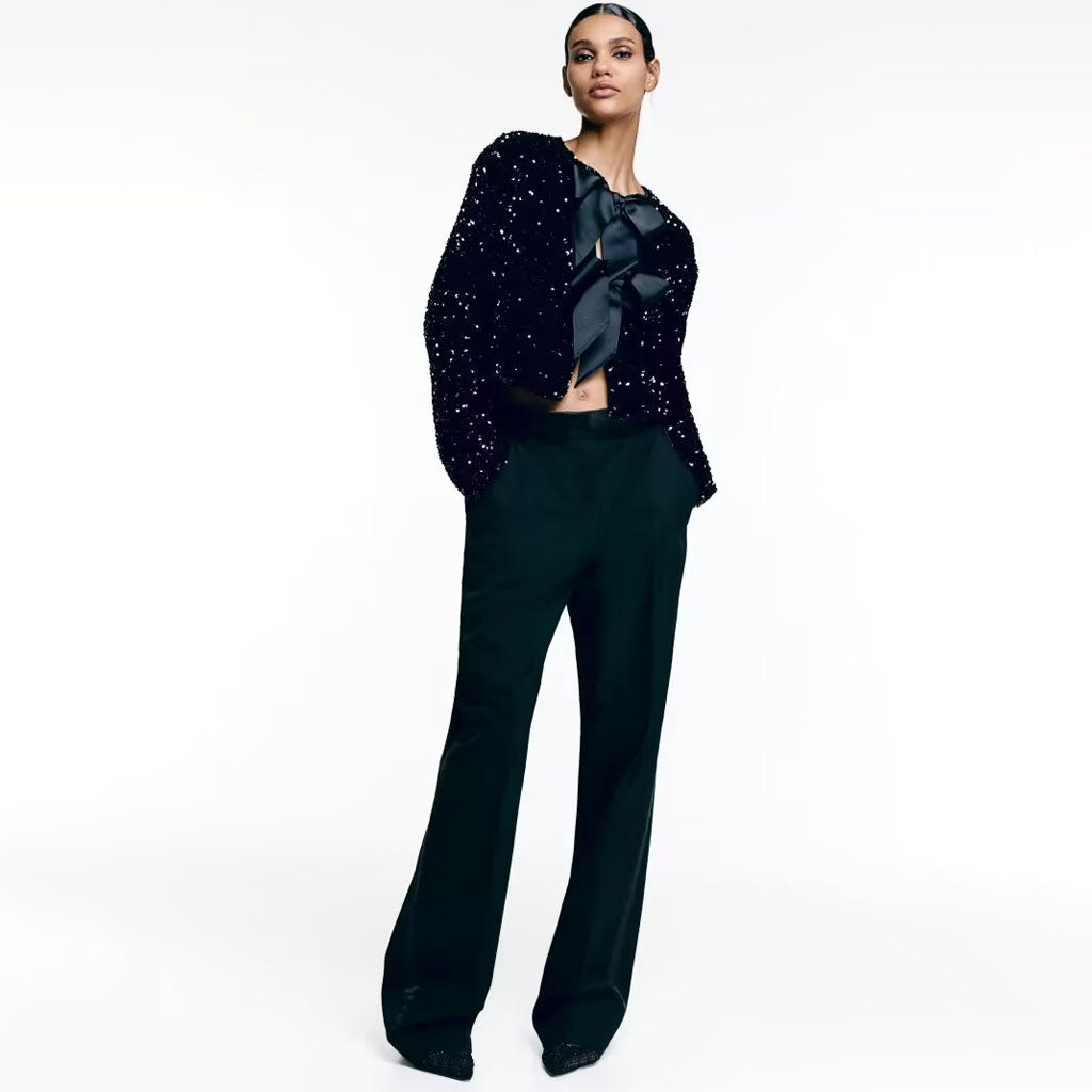 This sparkly designer velvet jacket is a true masterpiece of luxury. blending high-fashion finesse with playful charm. Big. bold bow ties adorning the front placket. complete with cheeky keyhole cutouts. It's all about the details �a round neck and long sleeves set the stage for a sparkling spectacle of sequin embellishments. This cropped creation isn't just a jacket. it's a statement. Whether you're strutting the high street or lighting up the night. this little number says. "I've arrived. and I'm fabulous!"