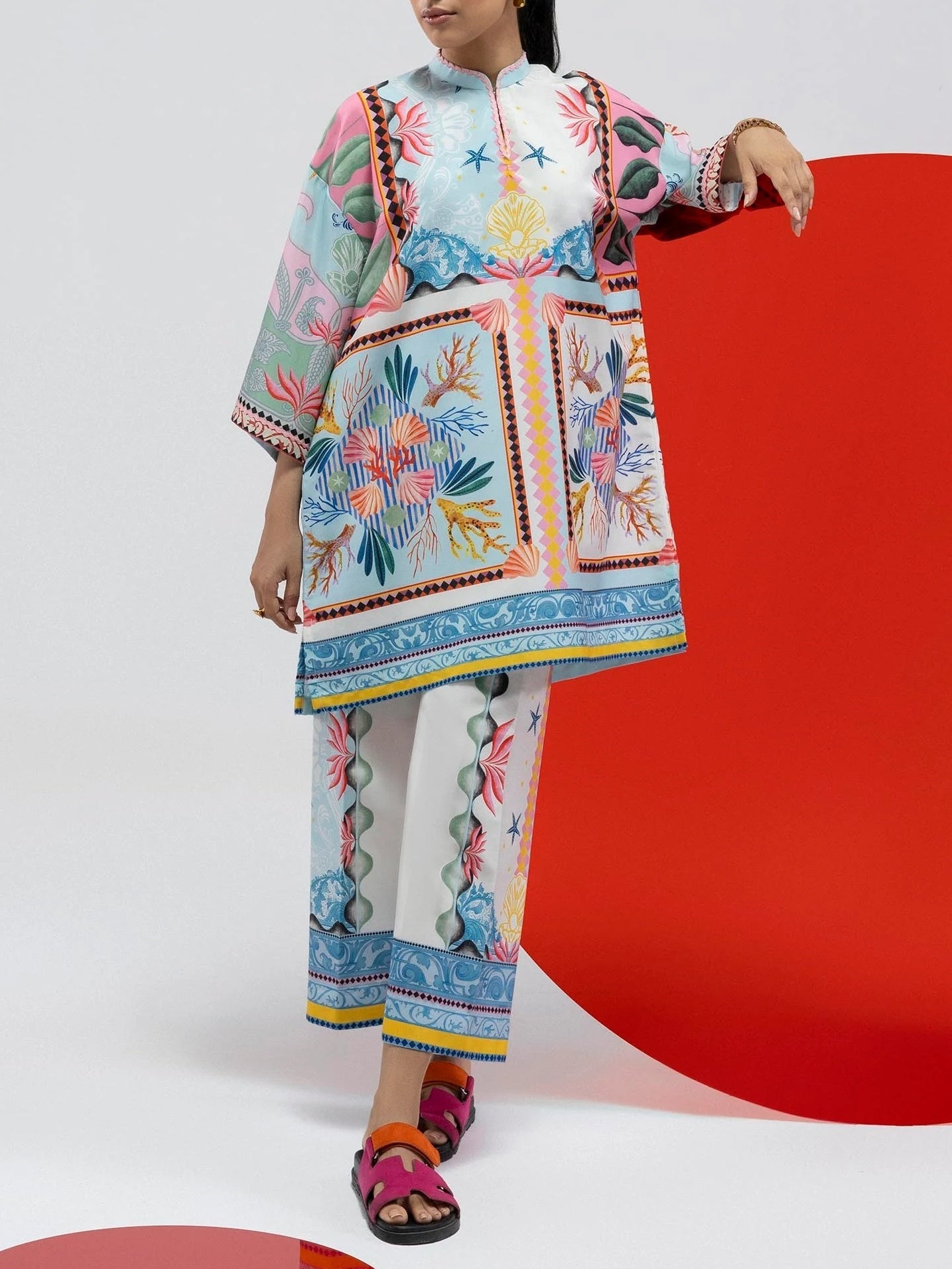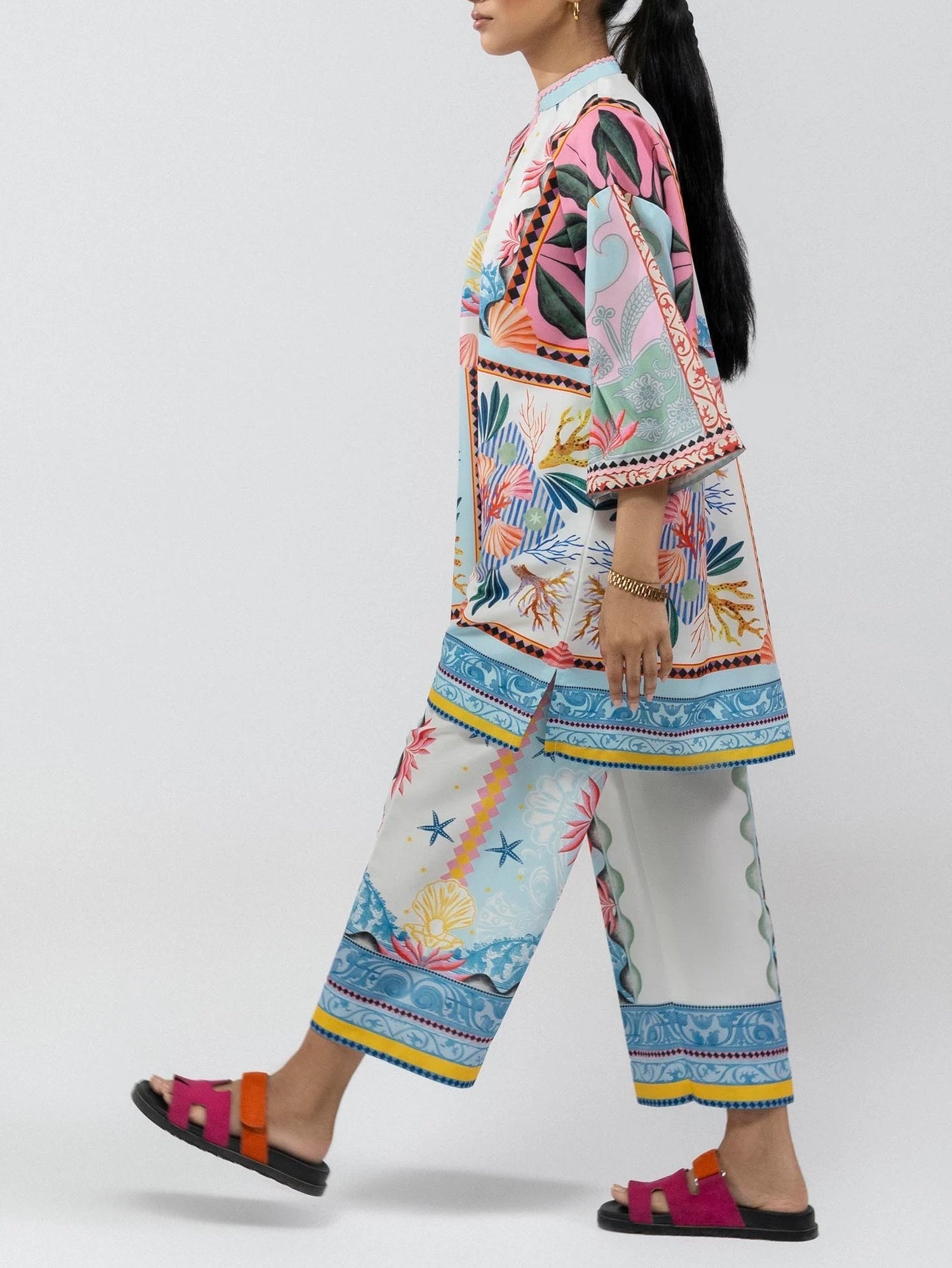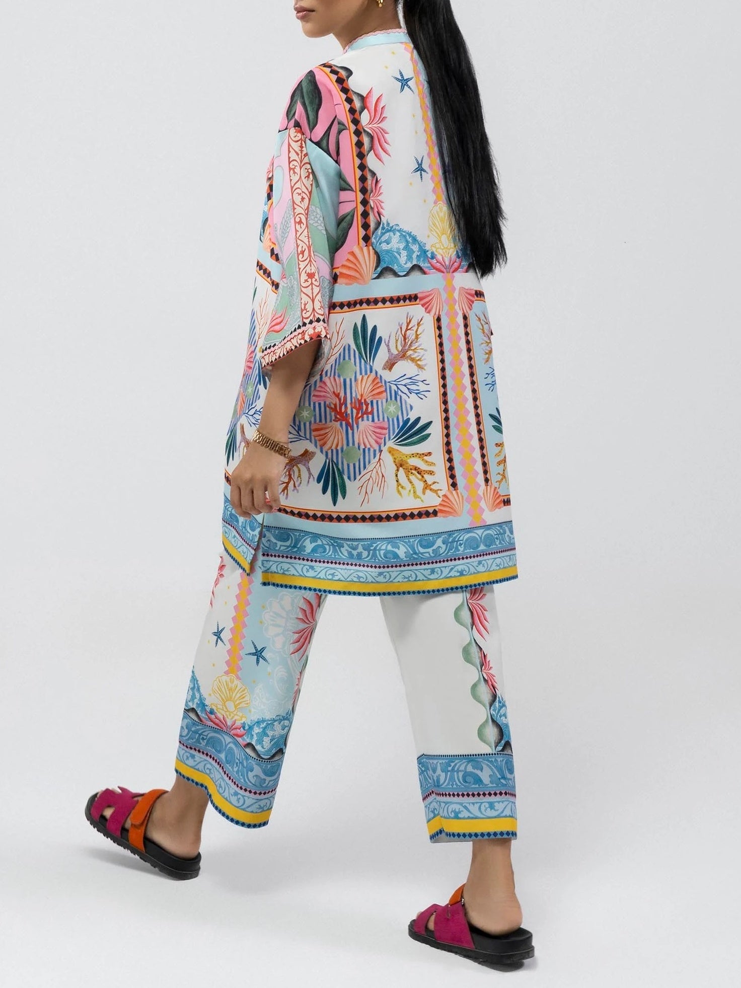 This co - ord set is a visual masterpiece inspired by the ocean. The top. featuring a medley of pastel hues. is adorned with vivid prints of sea plants. starfish. and other marine elements. Paired with white - based pants echoing the same lively patterns. it creates a harmonious look. The lightweight fabric ensures comfort. making it perfect for beach parties or summer events. adding a splash of vibrant. tropical charm to your outfit.