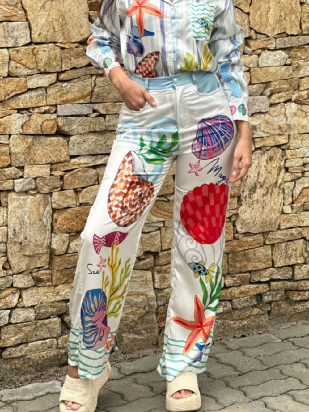 Step into summer vibes with our Ocean Theme Print Pants. These pants feature a captivating ocean-themed print that adds a playful touch to your outfit.