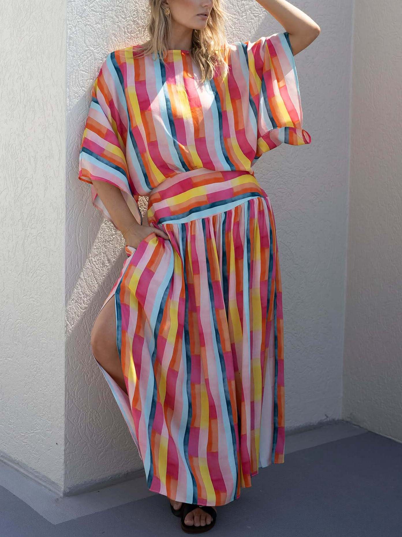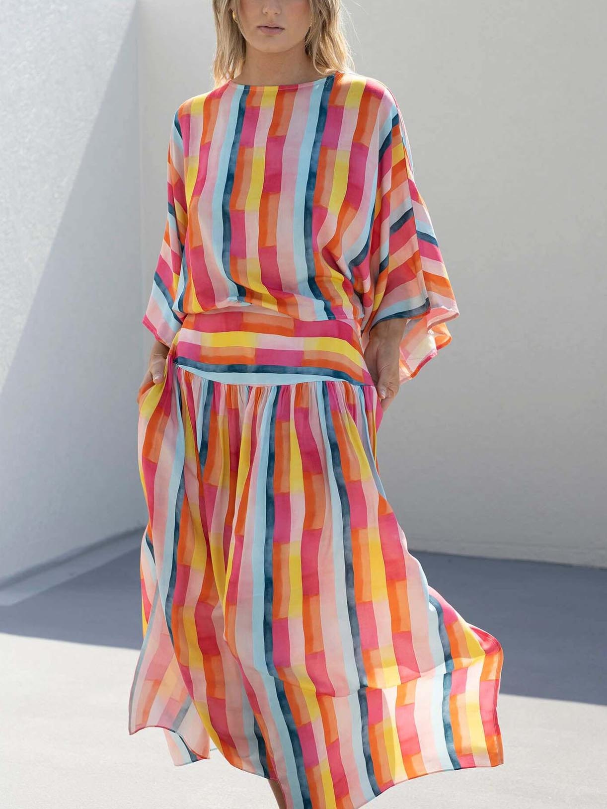 Our Painted Stripe Print Maxi Dress features stunning hand-painted stripes for an artistic appeal that will make a statement.